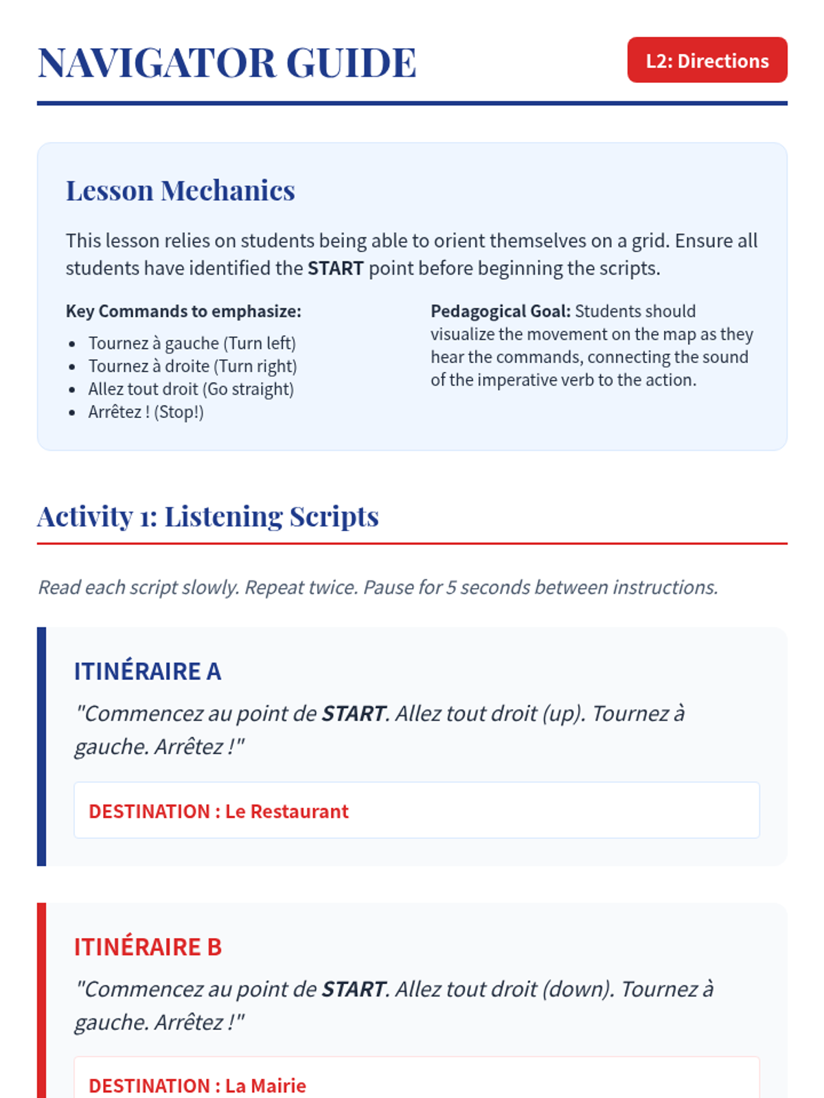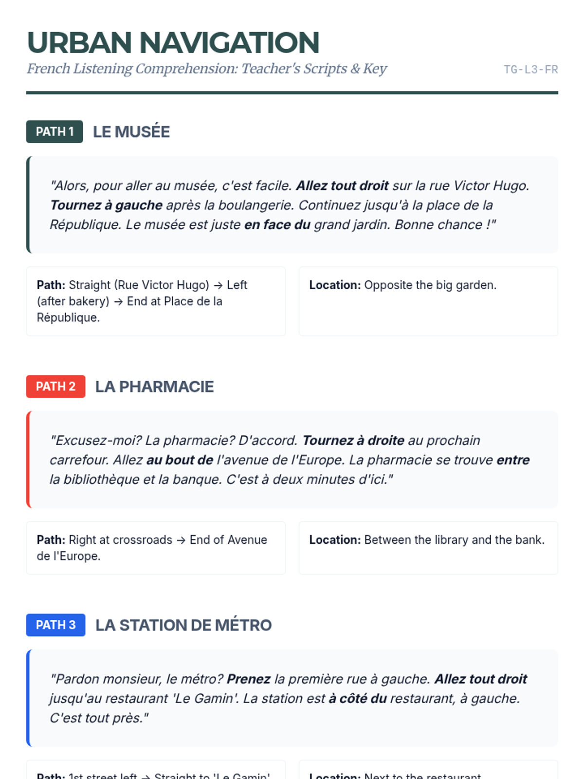 Learners practice listening for directional commands like 'turn left', 'go straight', and 'cross the bridge'. Using a city map, they trace a route with their finger as they listen to a guide giving walking directions.