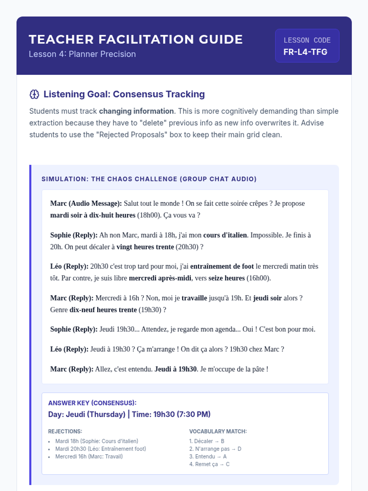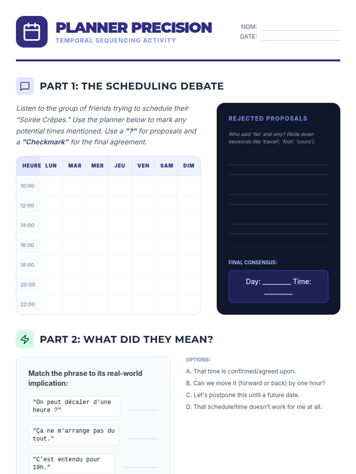 Concentrates on the 24-hour clock and calendar vocabulary to manage schedules and plans in French.