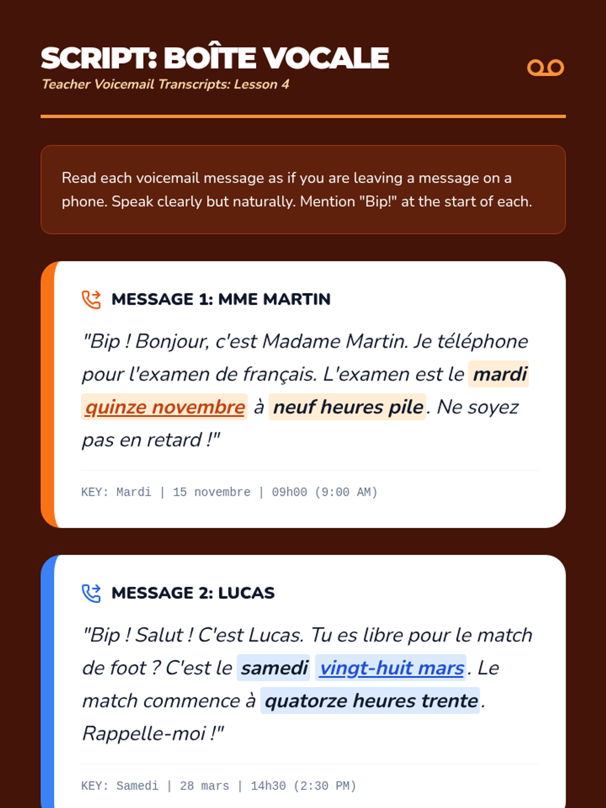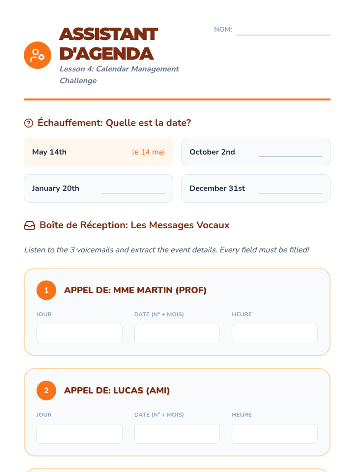 Students recognize days, months, and dates in the context of school announcements and voicemails.