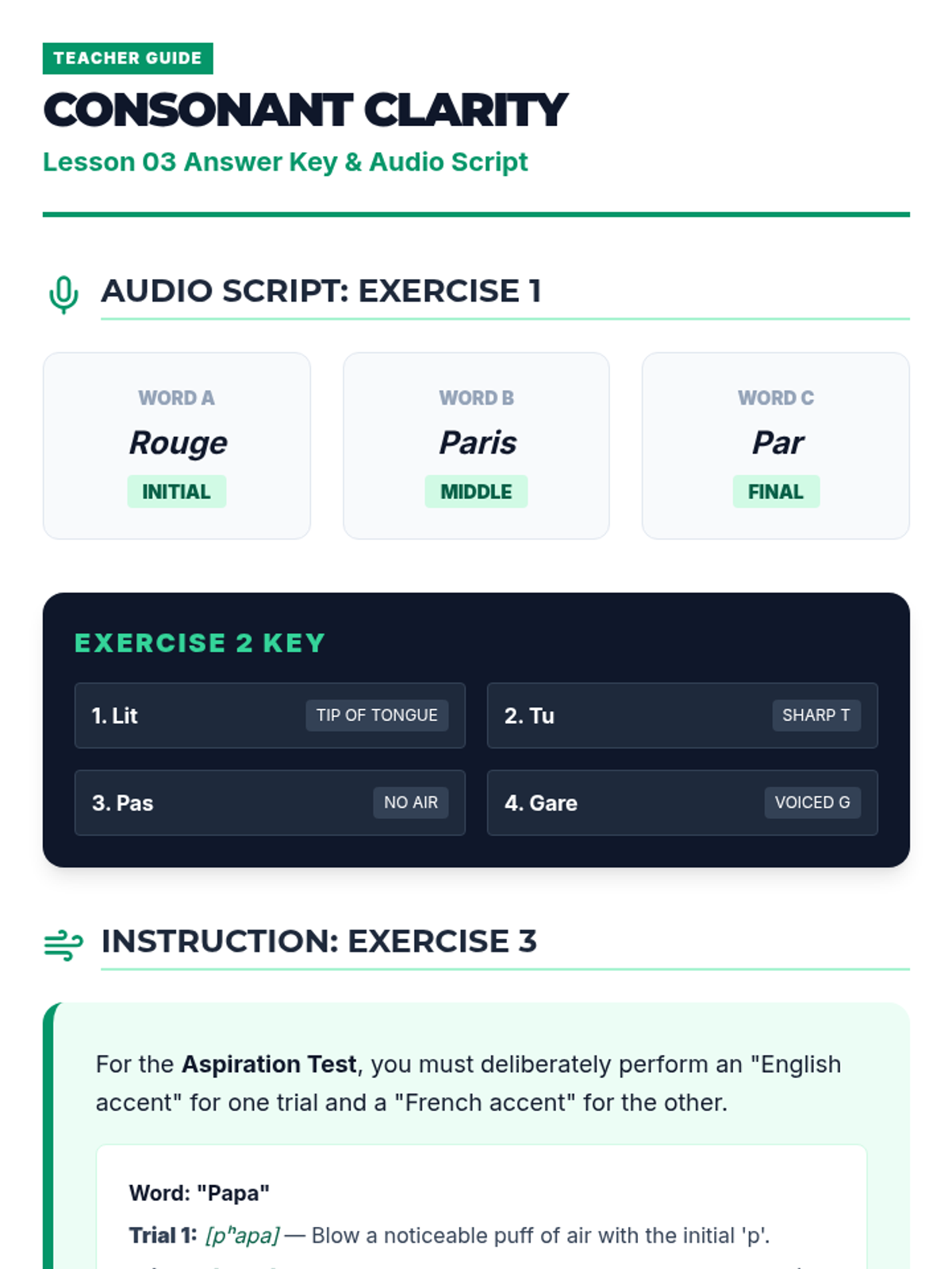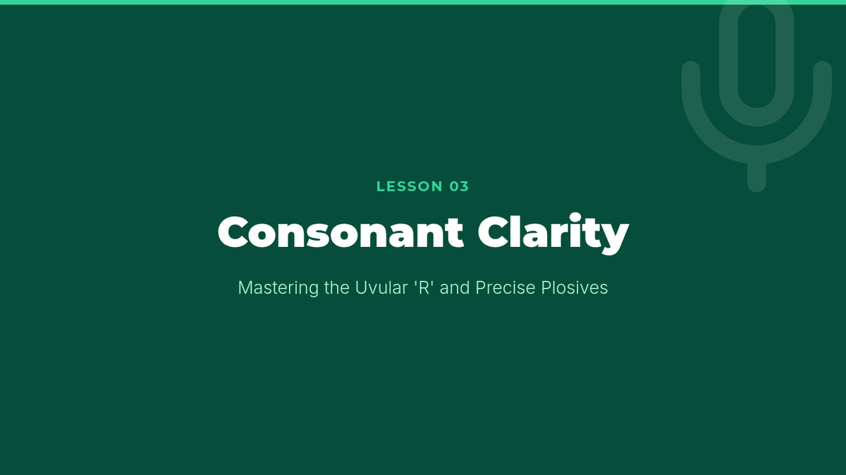 Covers consonant sounds unique to French, specifically the uvular 'R' and unaspirated stops (p, t, k).