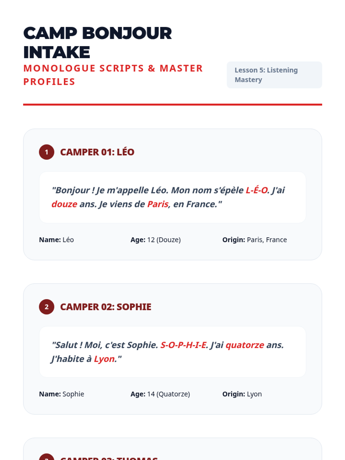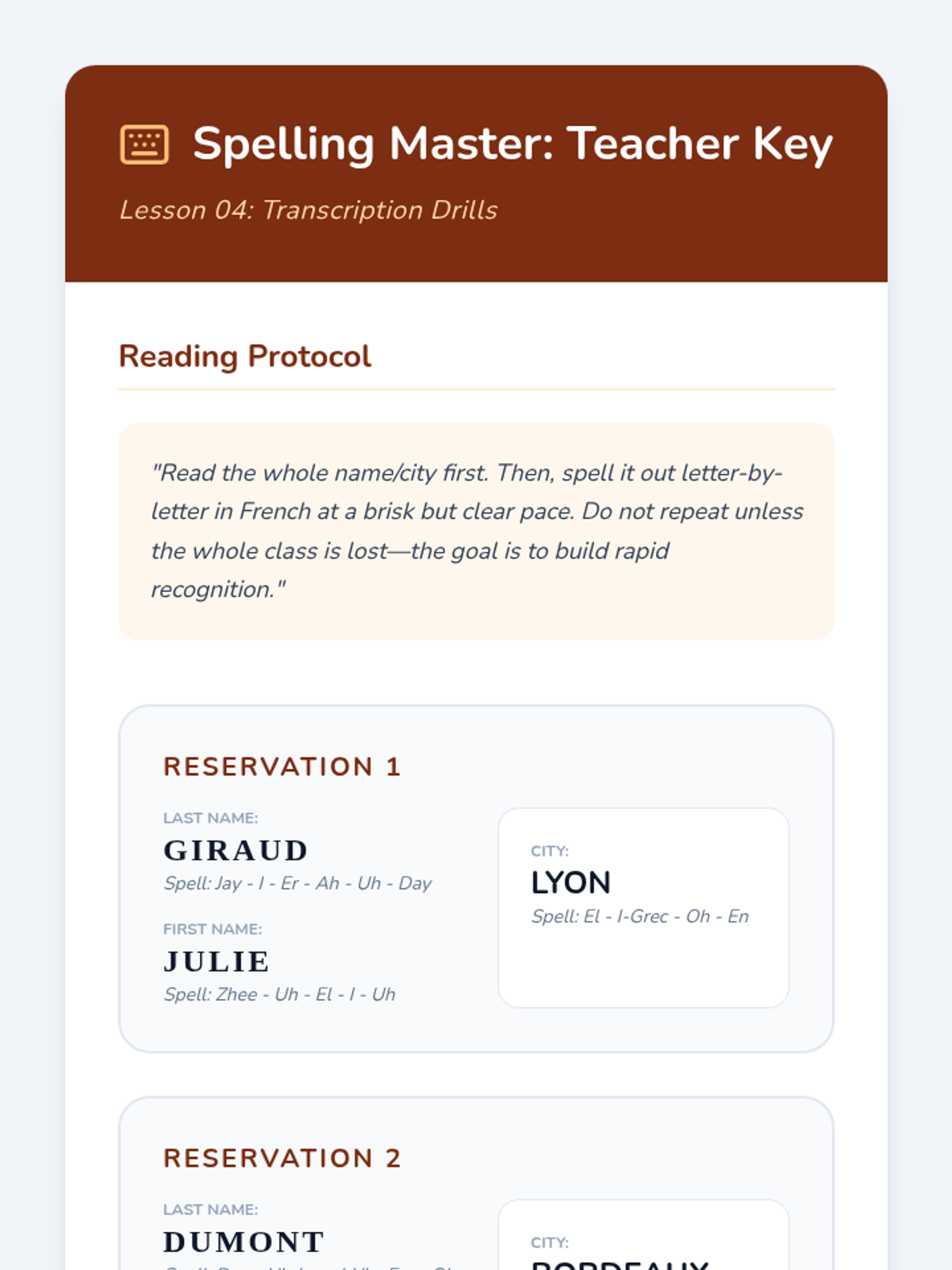 Focusing on the French alphabet, students practice listening to rapid-fire spelling of names and places.