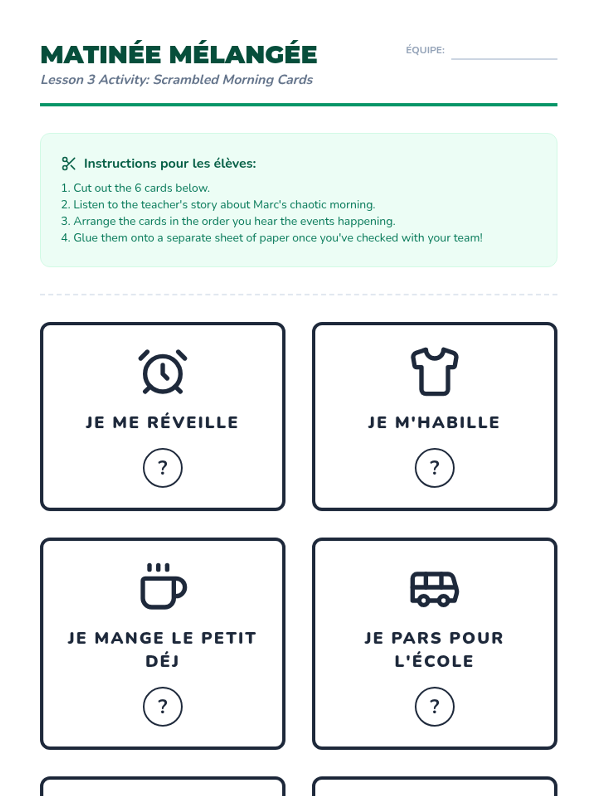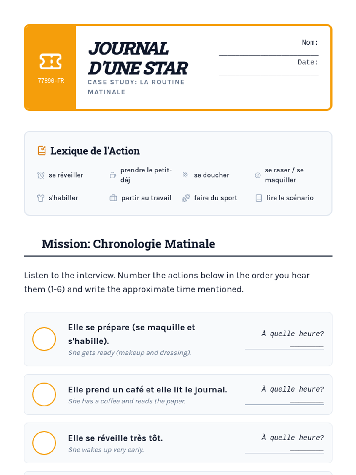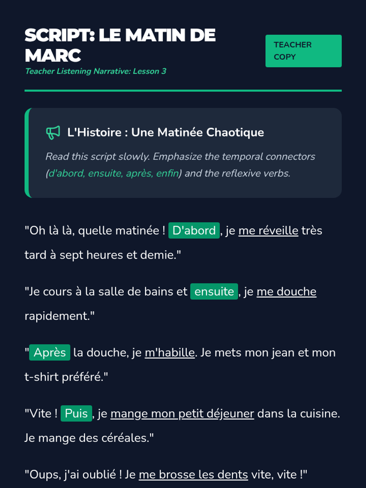 Focuses on sequencing daily routine events using reflexive verbs and temporal connectors like 'd'abord' and 'ensuite'.
