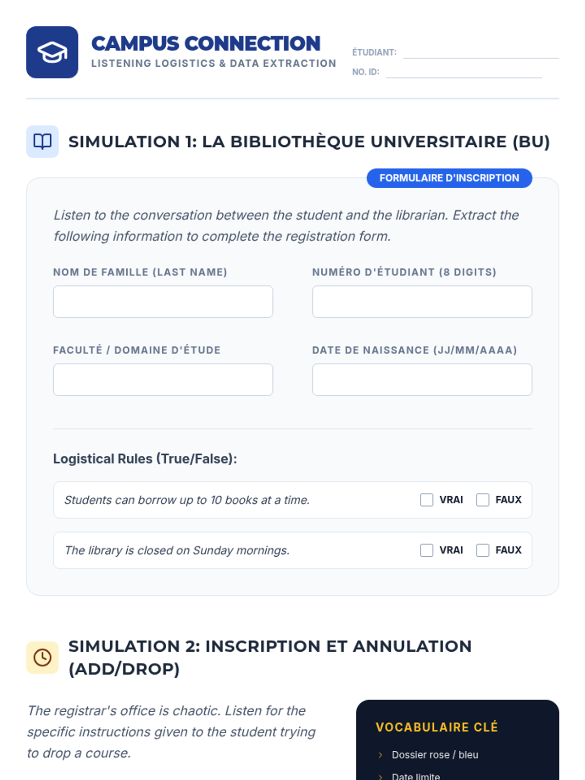 Focuses on extracting logistical details and academic instructions from campus-based French dialogues.