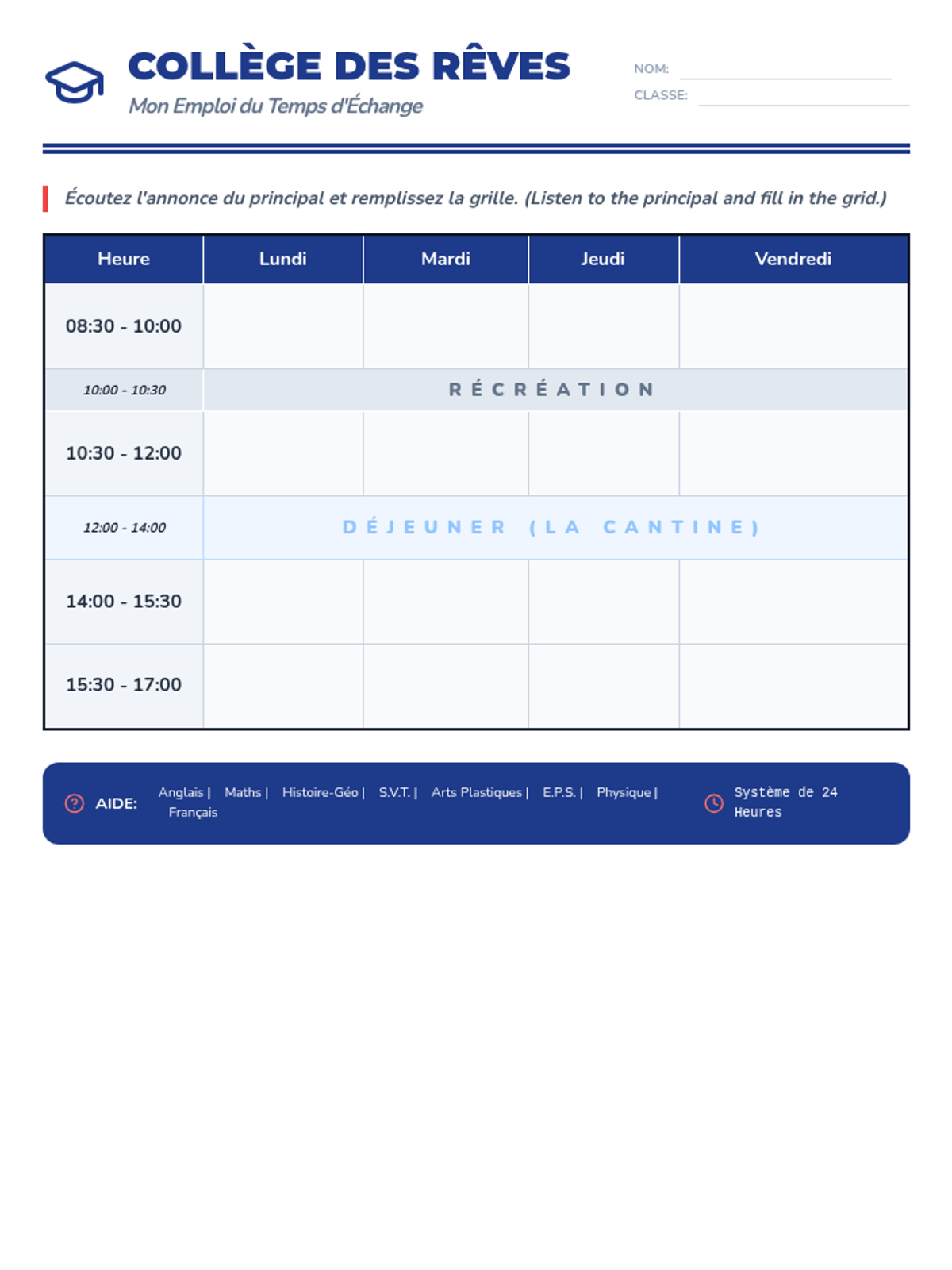 Students learn to listen for and identify time using the 24-hour system commonly used in France, matching spoken times to clock faces.