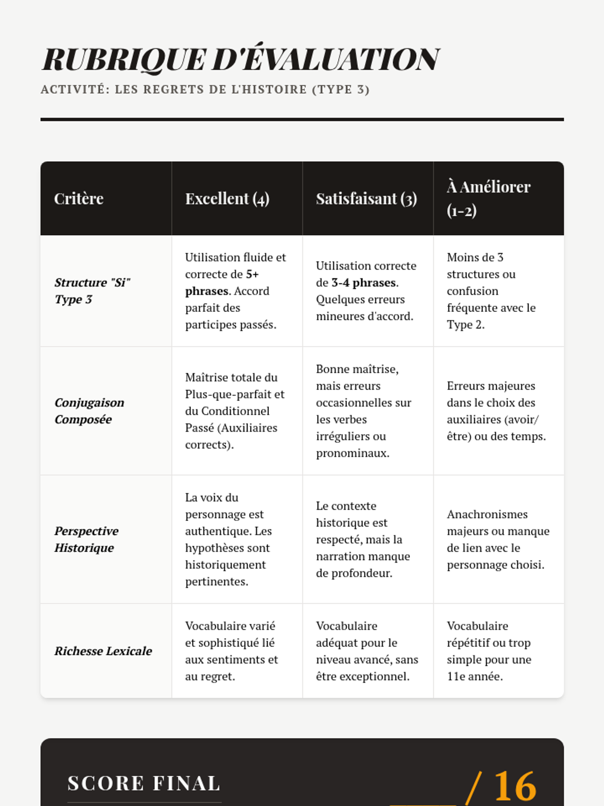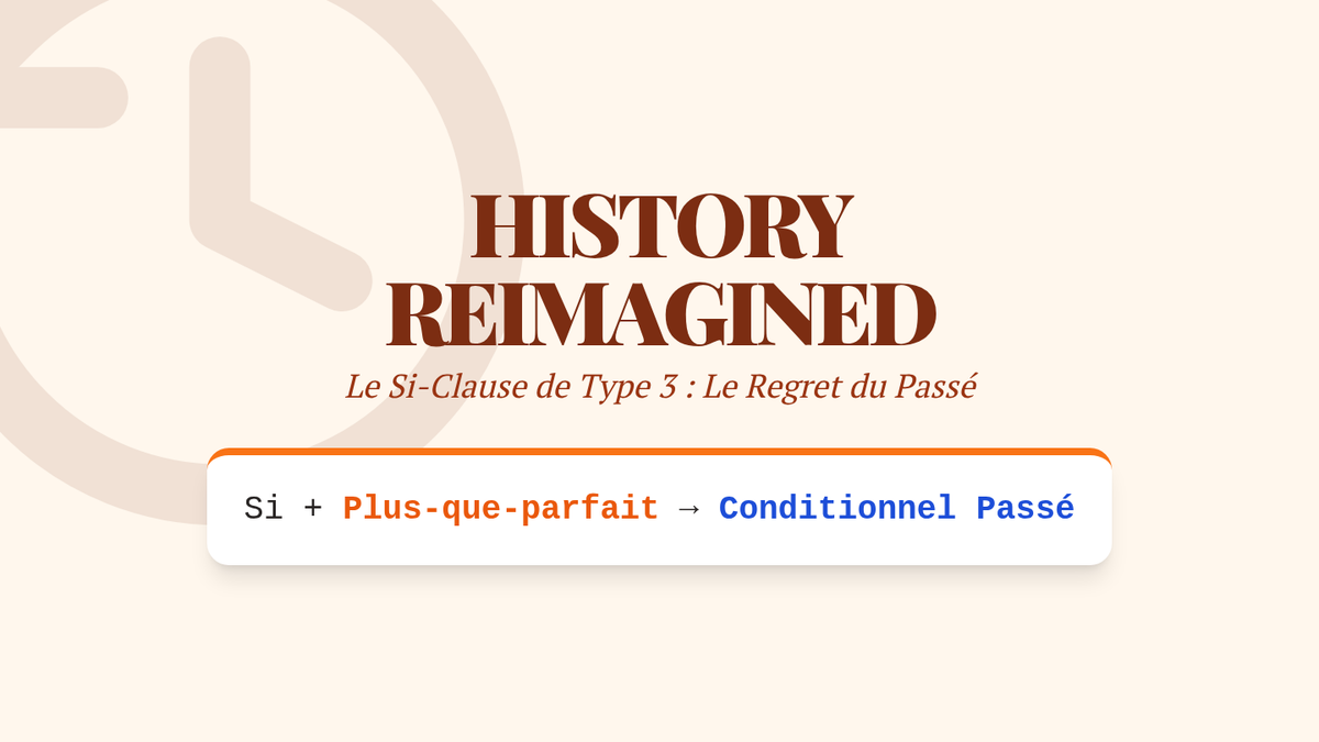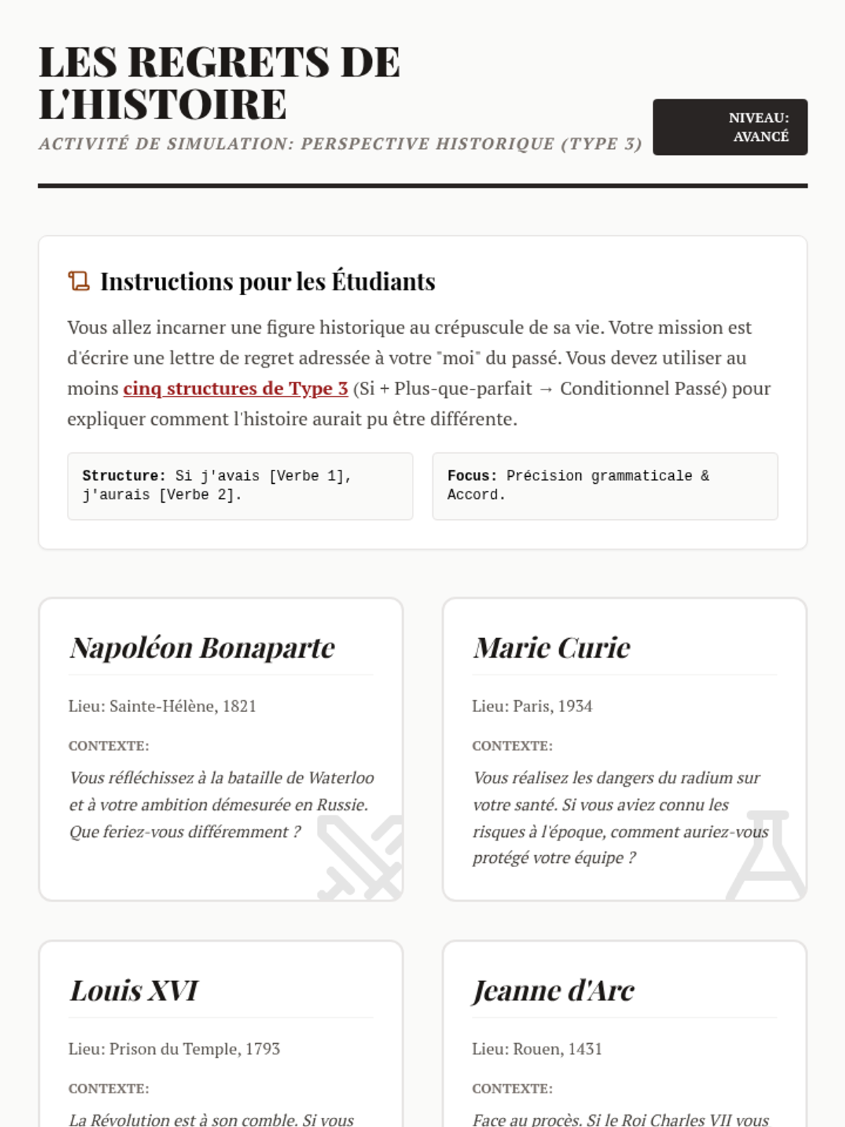 Focus on the Type 3 conditional structure (Si + PQP -> CP) to express regrets about the past. Students take on historical personas to rewrite history through 'what if' scenarios.