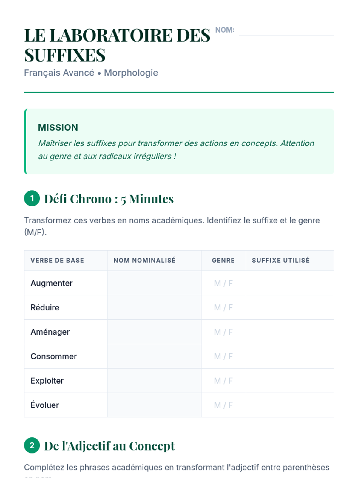 A deep dive into French morphology focusing on common suffixes used to transform verbs and adjectives into nouns. Students learn to predict word forms and recognize gender patterns in nominalized nouns.
