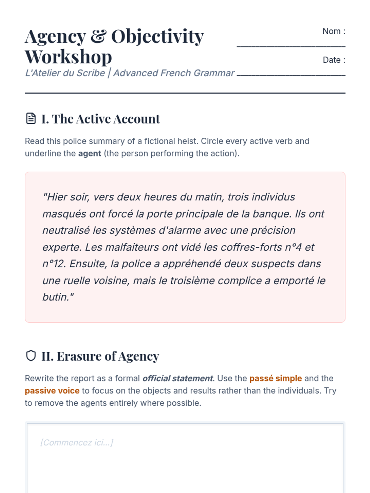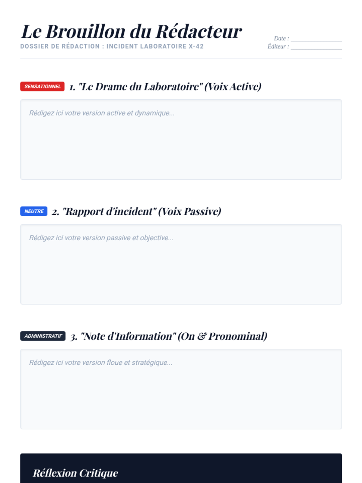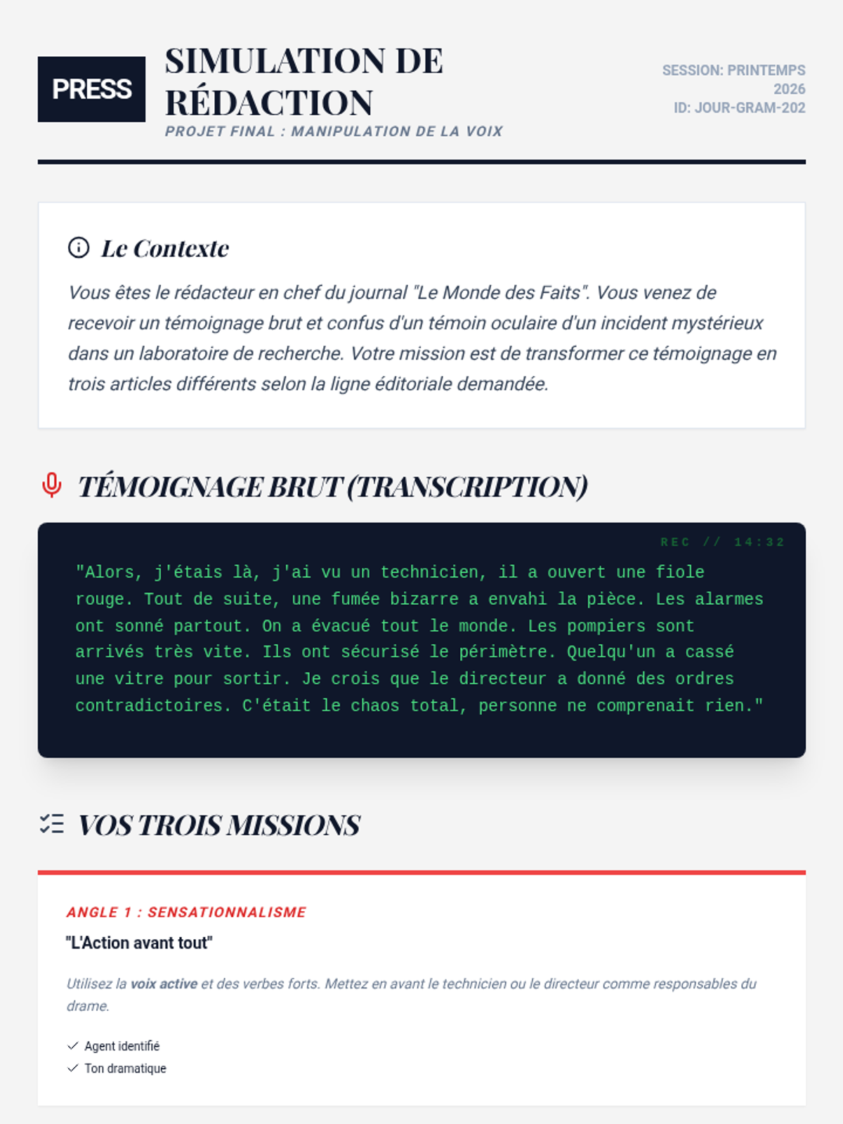 Students act as editors, rewriting a chaotic witness account into three versions: a sensationalist active account, a neutral passive report, and a formal administrative summary.