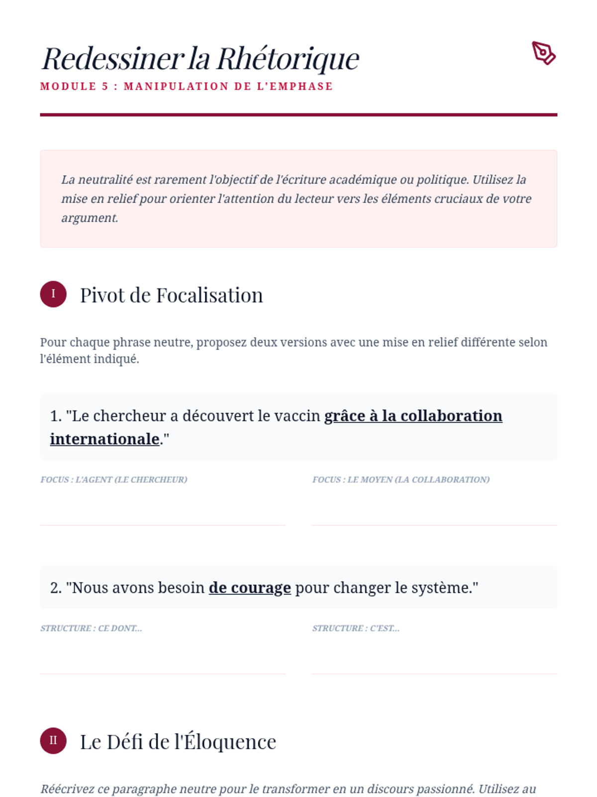 Exploring 'mise en relief' (cleft sentences) to manipulate focus and rhetorical emphasis in both spoken and written academic French.