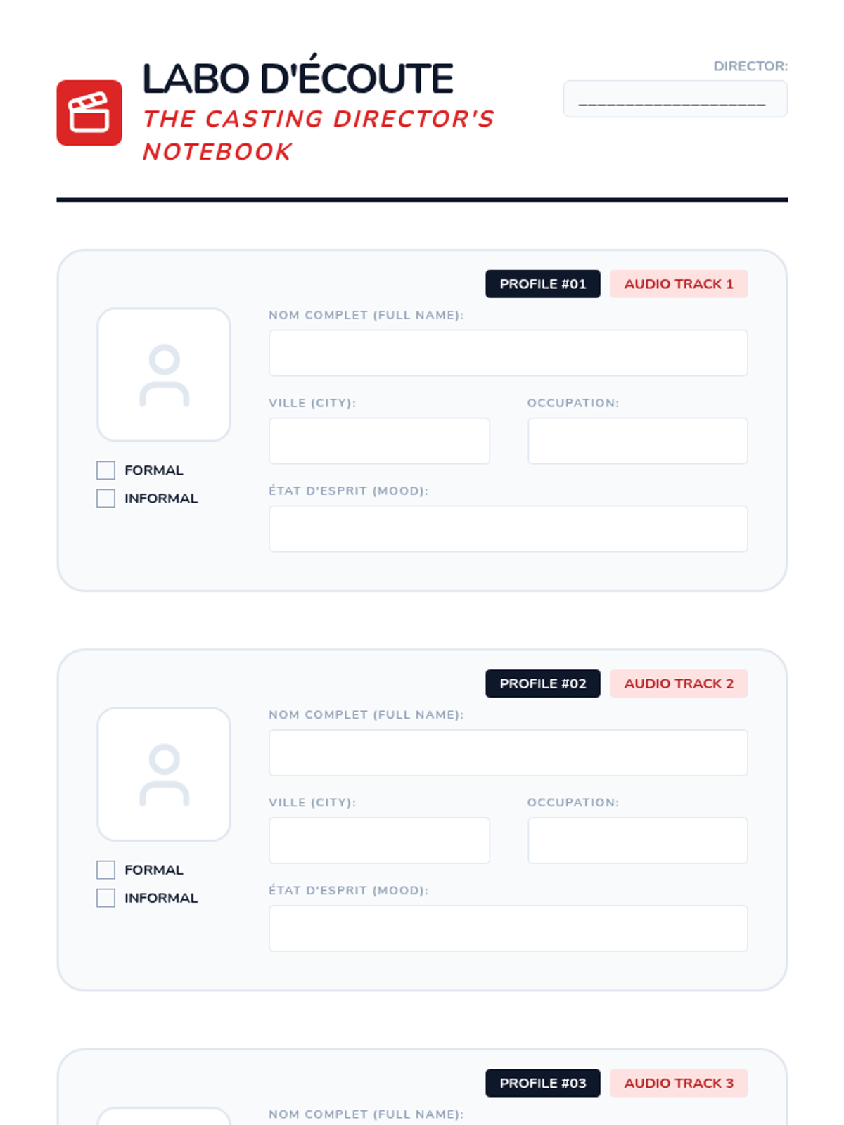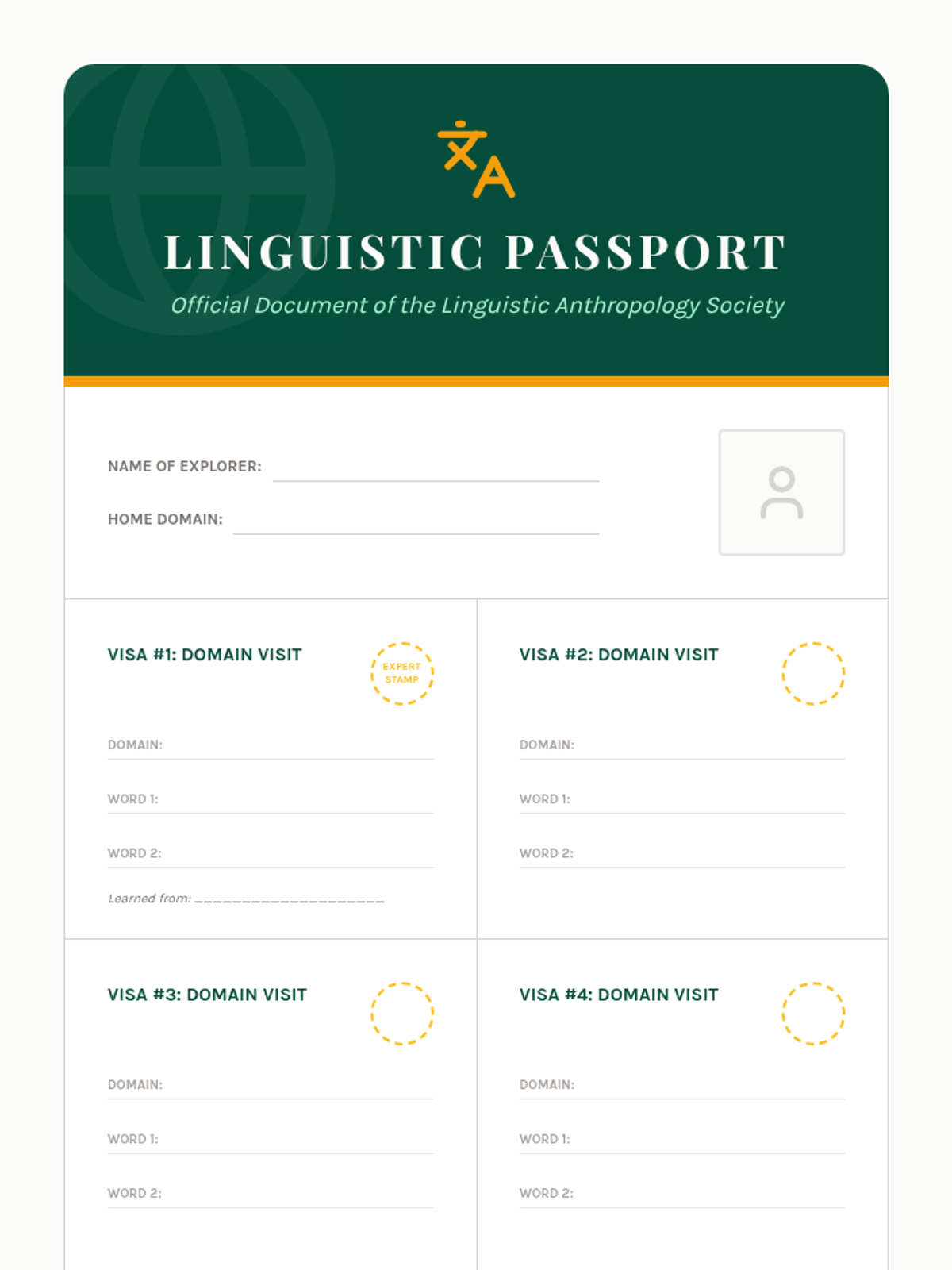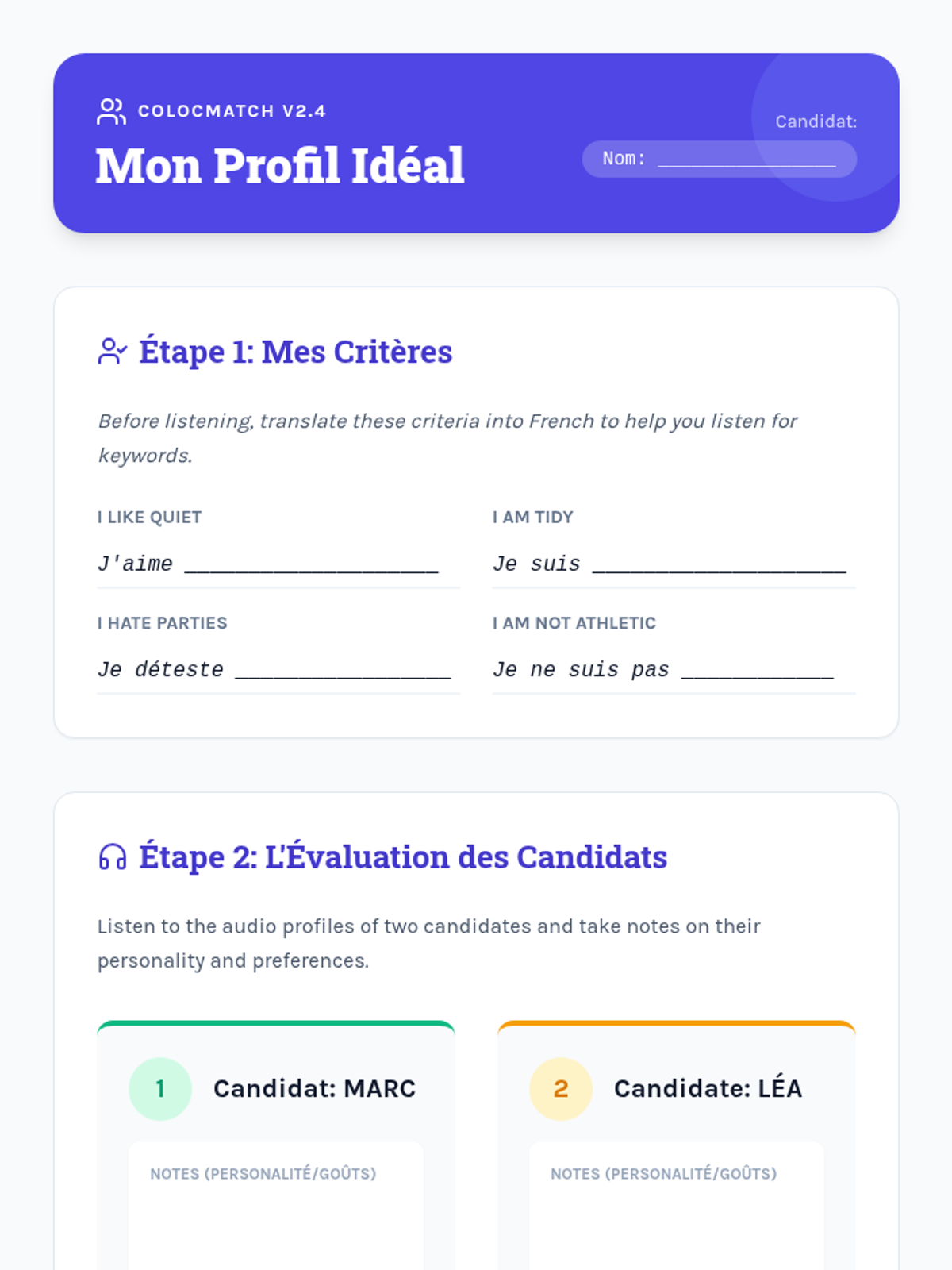 Students listen to complete introductory monologues containing name, origin, and basic state of being to complete biographical data sheets.