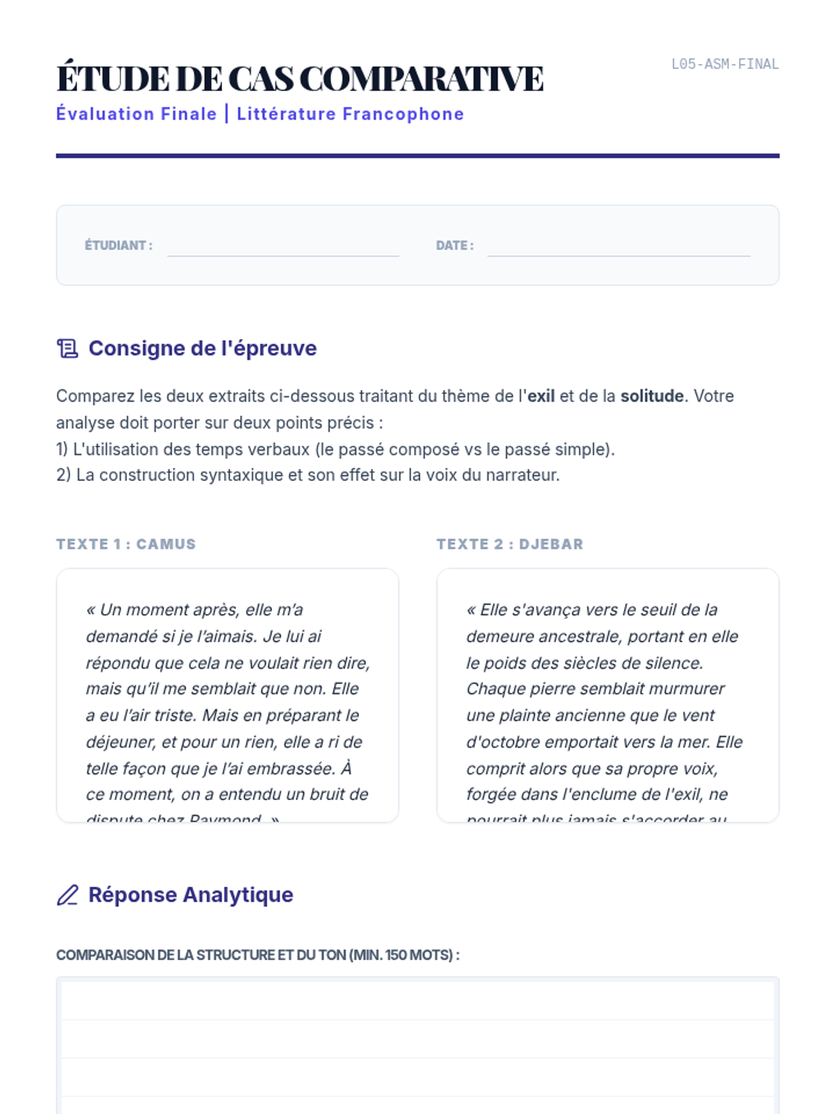 Synthesize skills by performing a comparative analysis of two Francophone texts, focusing on register, tone, and thematic expression of exile.