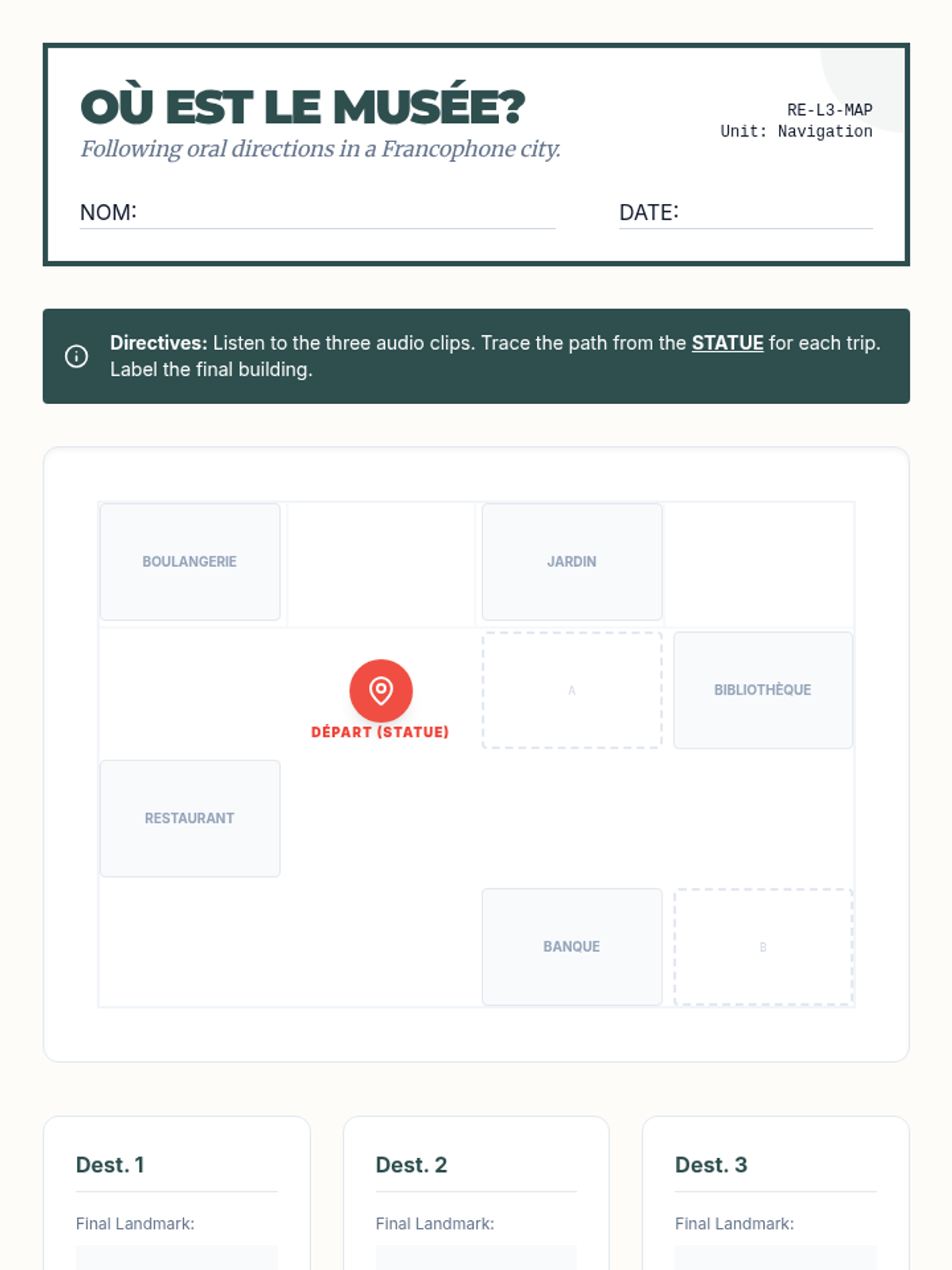Students practice identifying platforms, delays, and destinations from authentic-style metro and train announcements. Focus is on imperative verbs and travel-specific vocabulary through a route-mapping simulation.