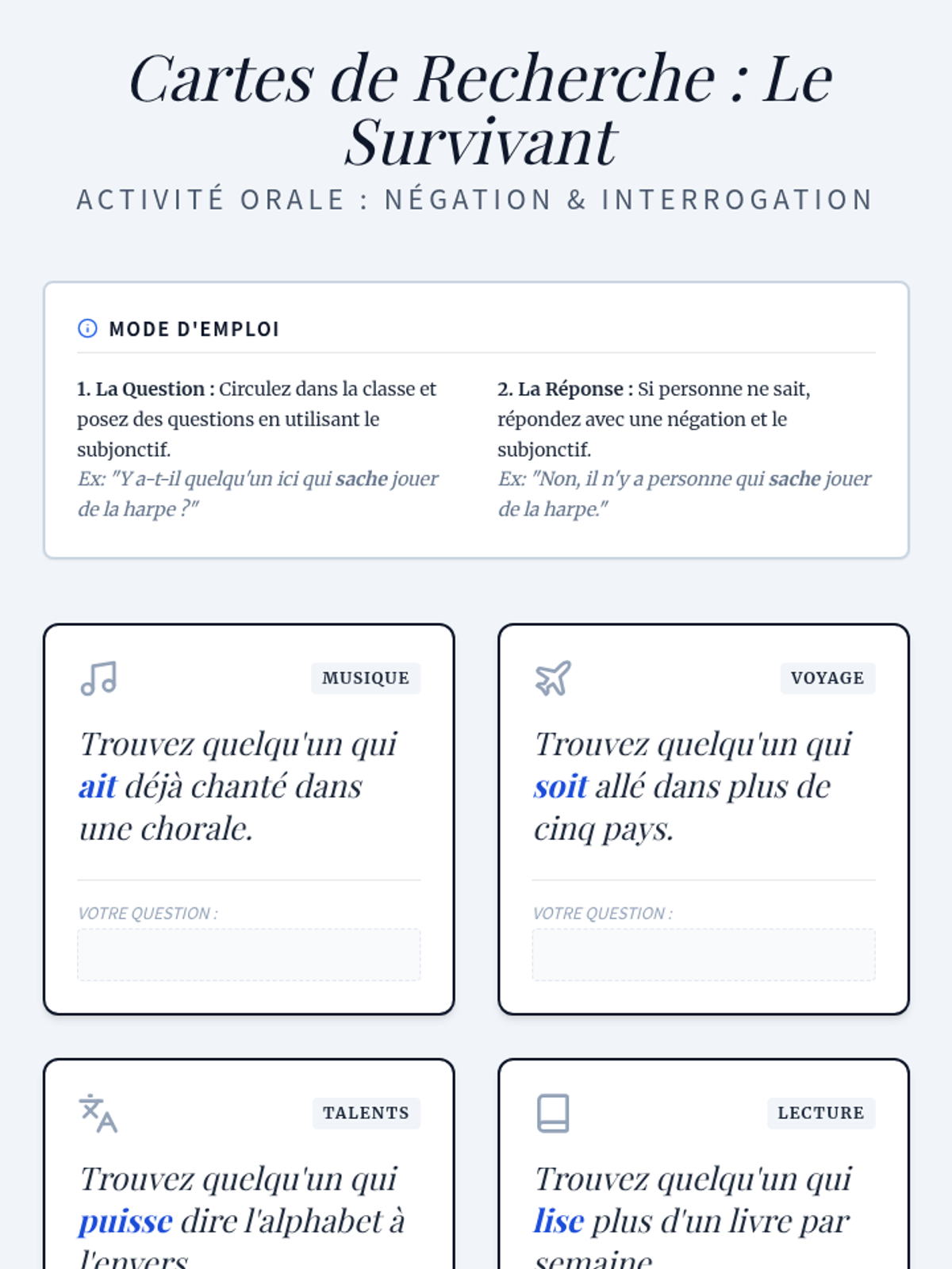 A rapid review of Type 1 (Present/Future) and Type 2 (Imperfect/Conditional) 'si' clauses. Students engage in a game-based superstitions activity to solidify foundational structures.