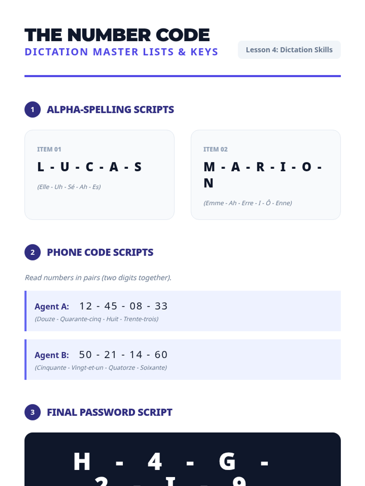 Develops rapid recognition and transcription skills for the French alphabet and numbers 0-60 through code-breaking dictation activities.