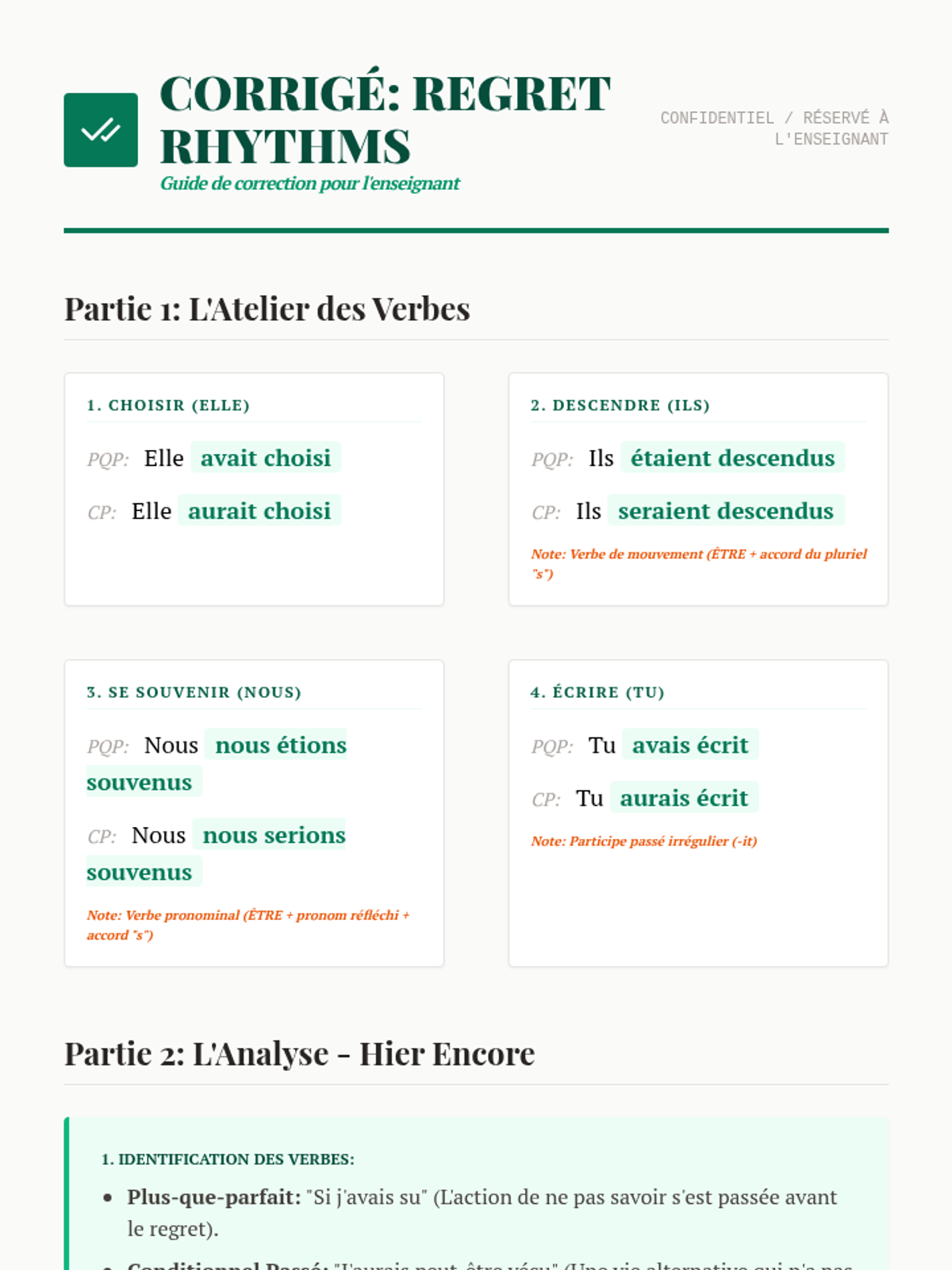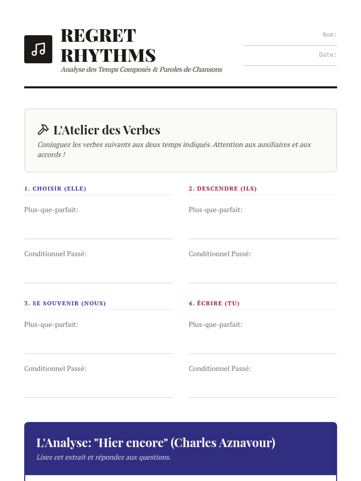 Instruction on the mechanics of the pluperfect (plus-que-parfait) and conditional past (conditionnel passé) tenses. Students analyze song lyrics to see these tenses in an emotional context.