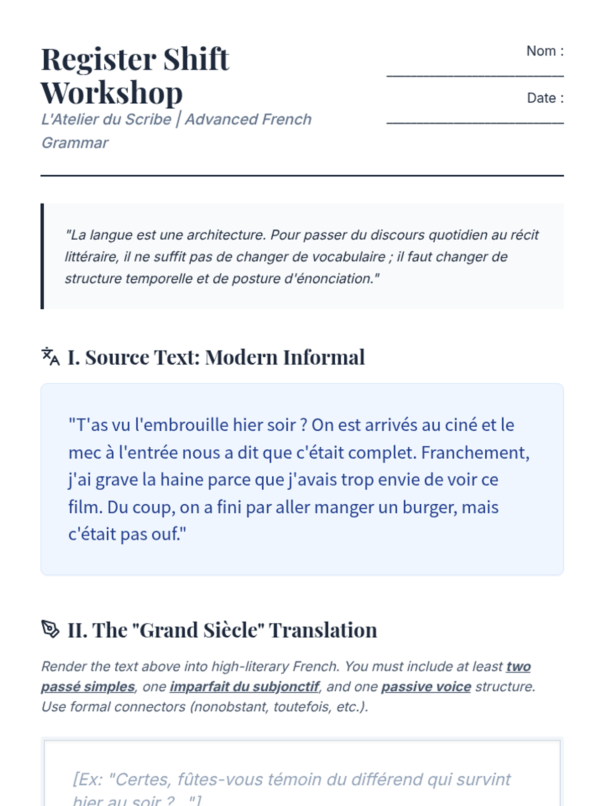 A bidirectional translation workshop moving between informal spoken French and high-literary style, applying all learned structures to elevate register.