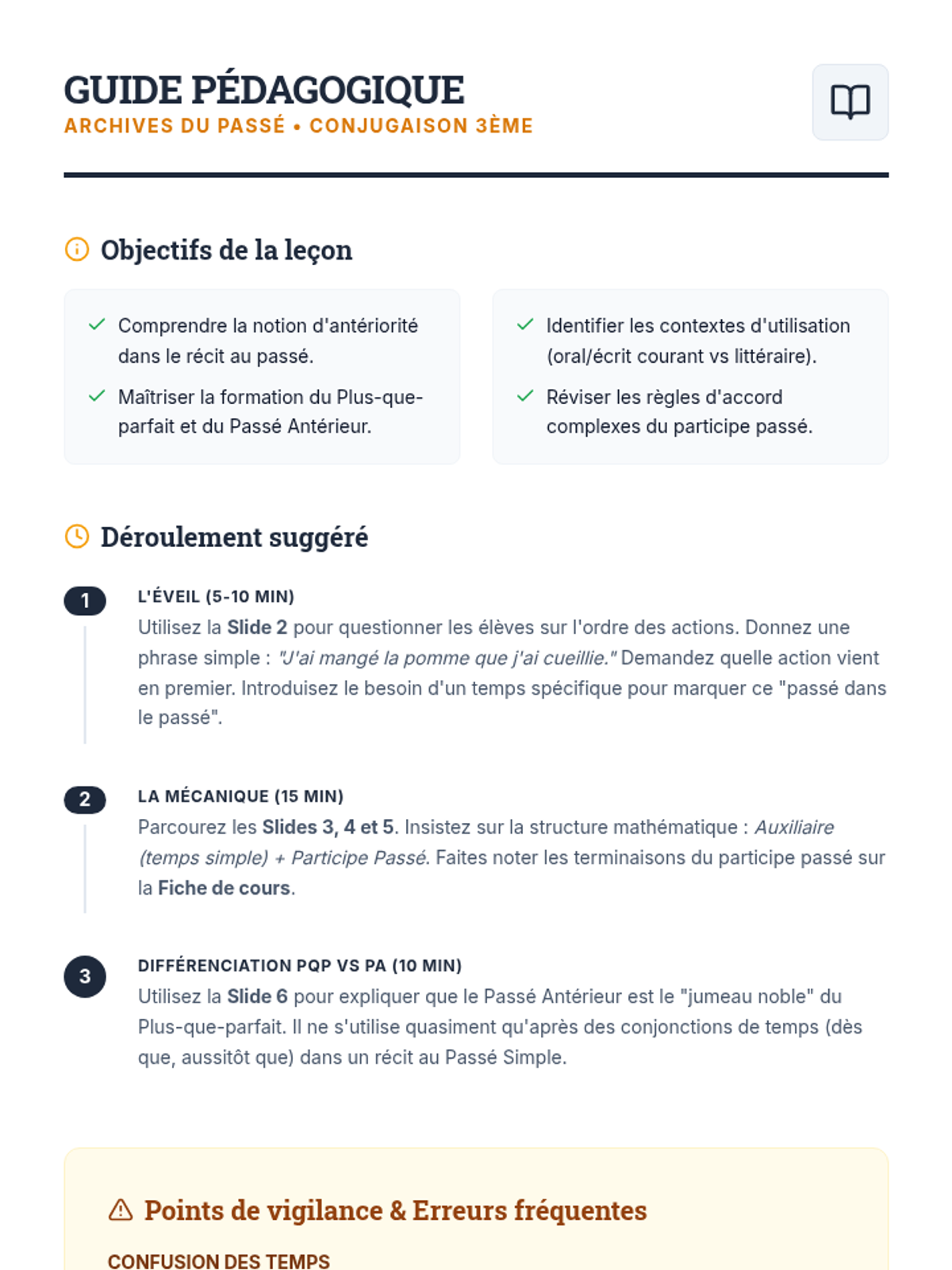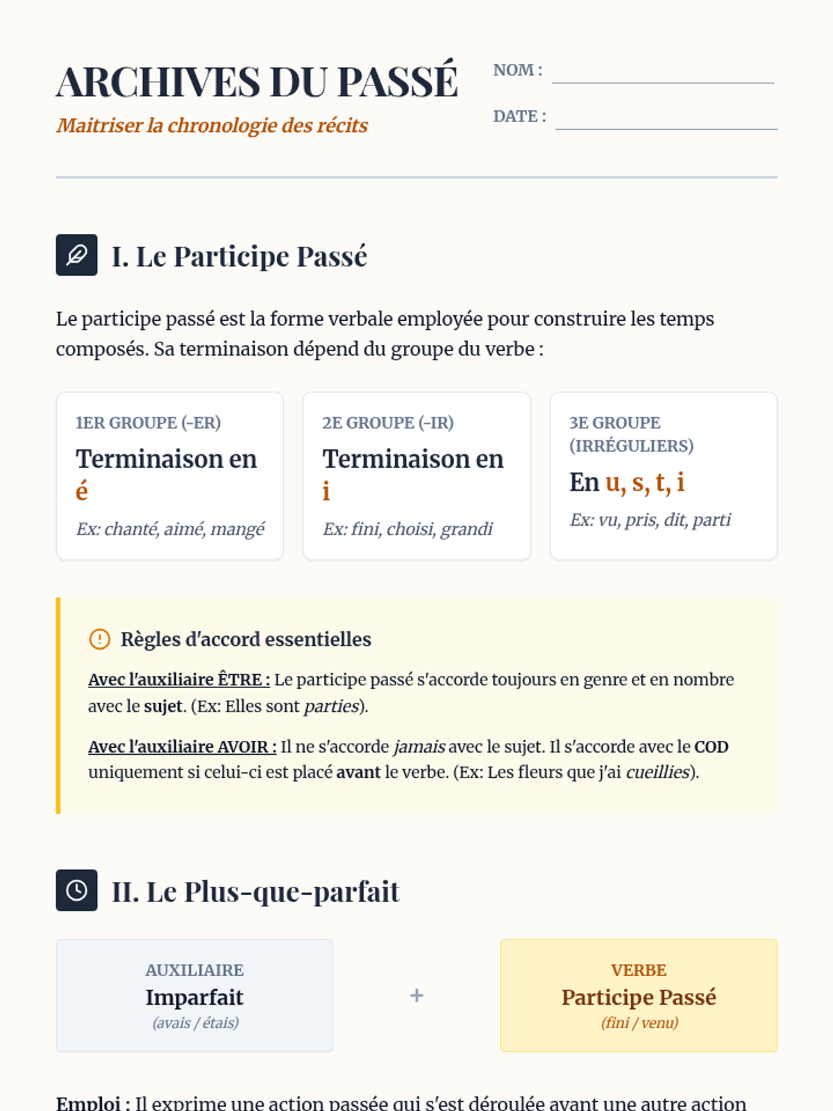 Cette leçon explore la formation et l'emploi du participe passé, du plus-que-parfait et du passé antérieur, en mettant l'accent sur la chronologie des actions passées.