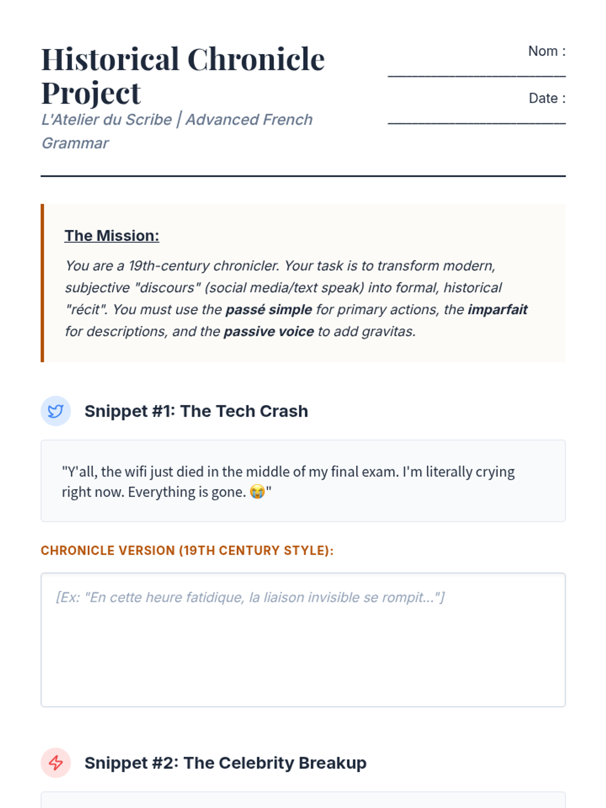 Students analyze the linguistic distinction between 'récit' and 'discours' and practice transforming modern news into 19th-century chronicles.