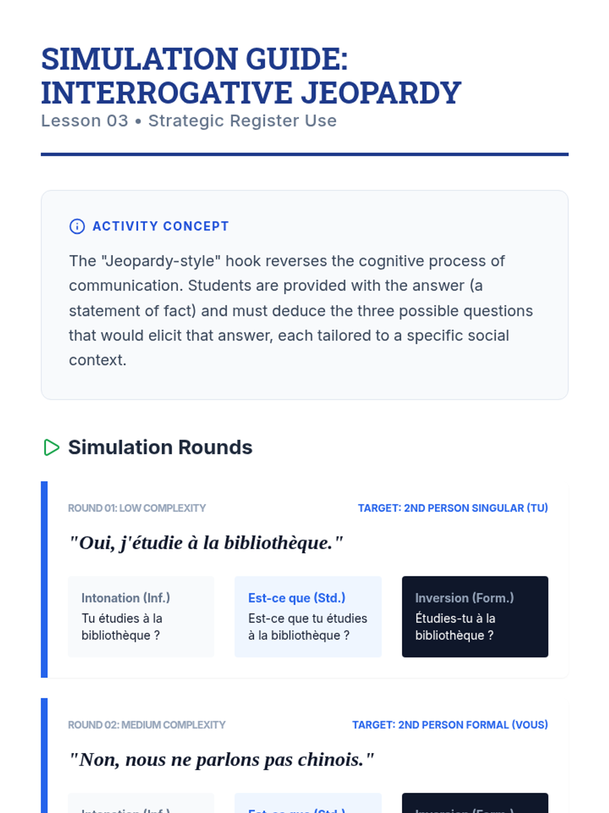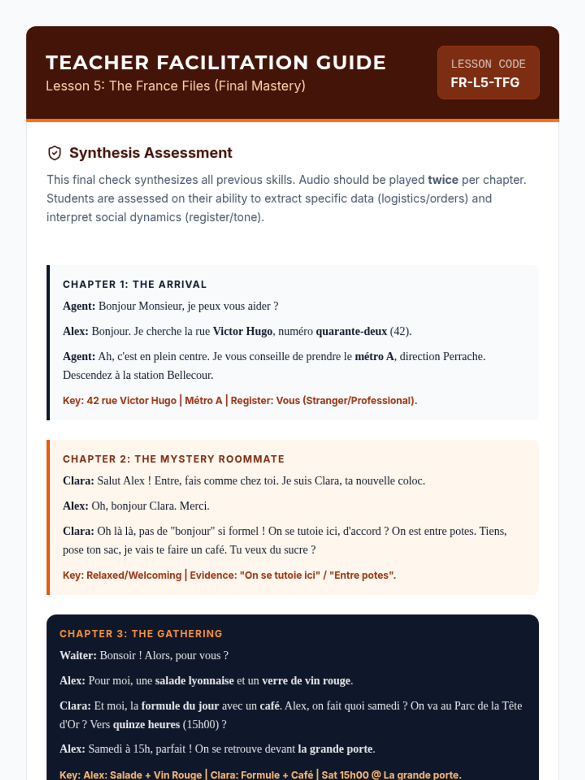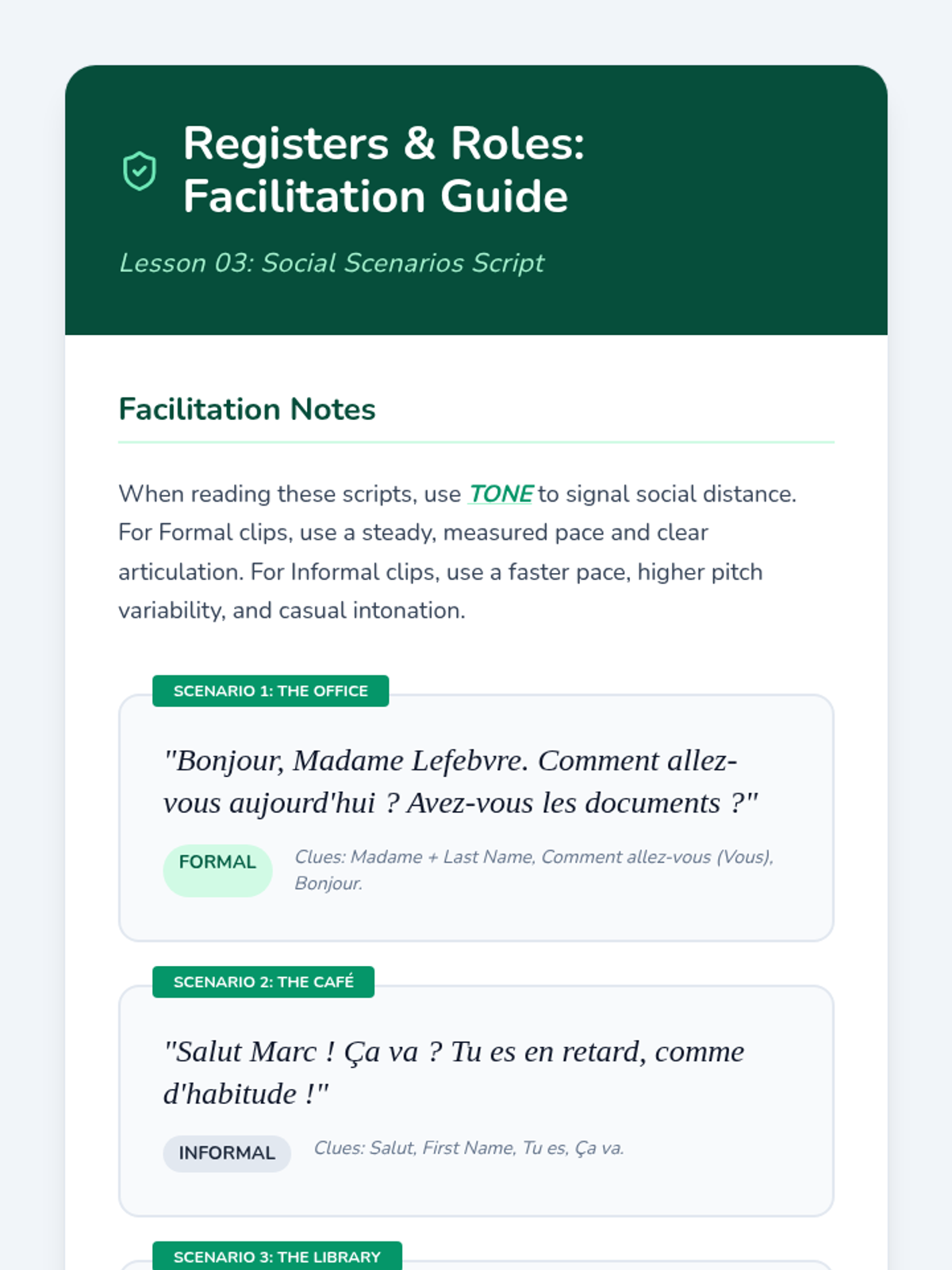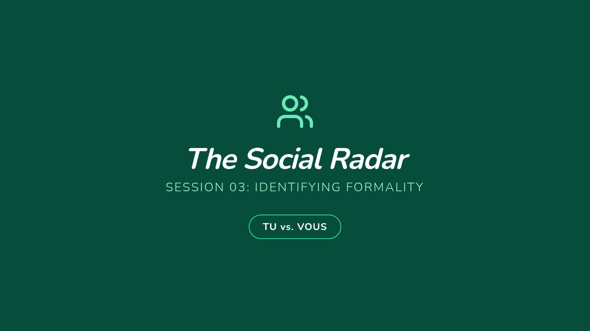 Students learn to identify social dynamics by listening for 'tu' vs 'vous' and formality markers in various French social contexts.