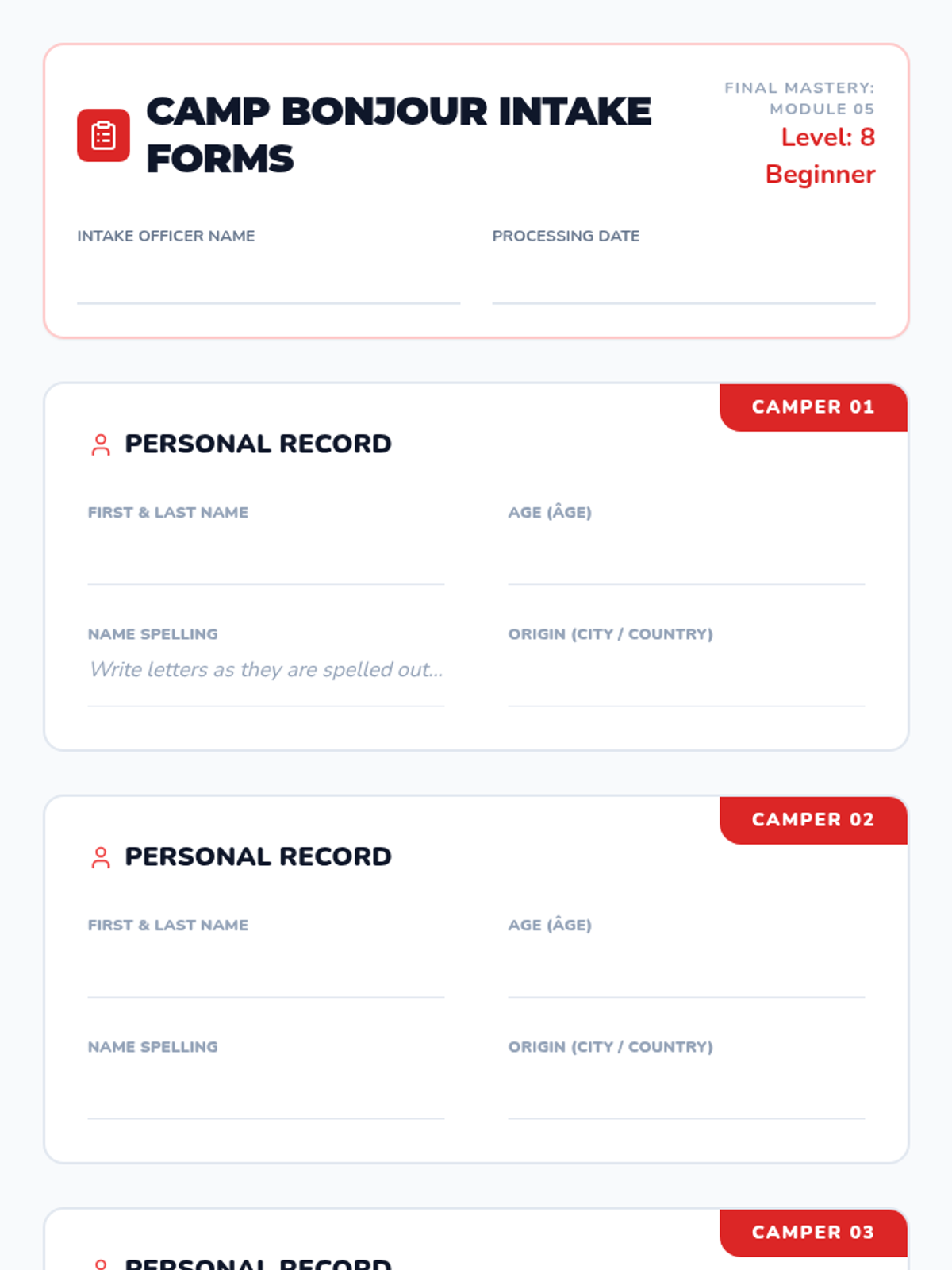 Culminates the sequence by having students synthesize their listening skills to comprehend and extract key details from full personal introductions.