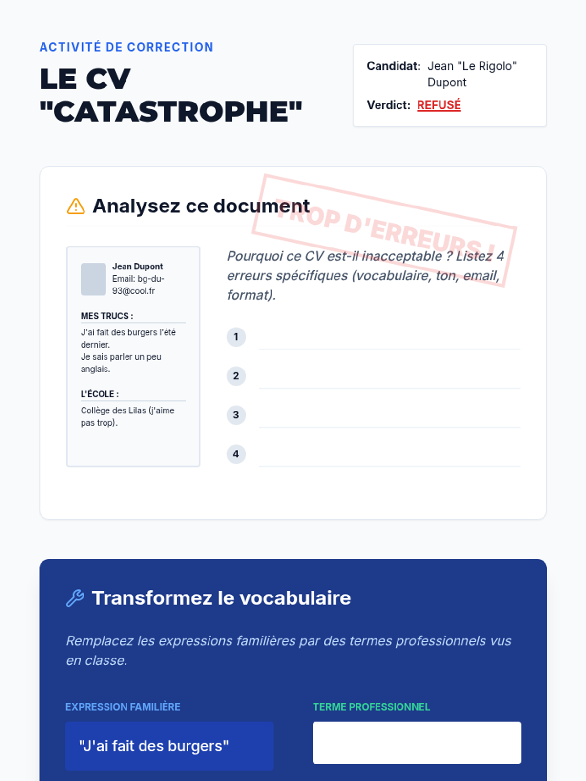 Focusing on written expression, this lesson guides students through the structure of a standard French 'CV' (Curriculum Vitae) and identifies key formatting standards.