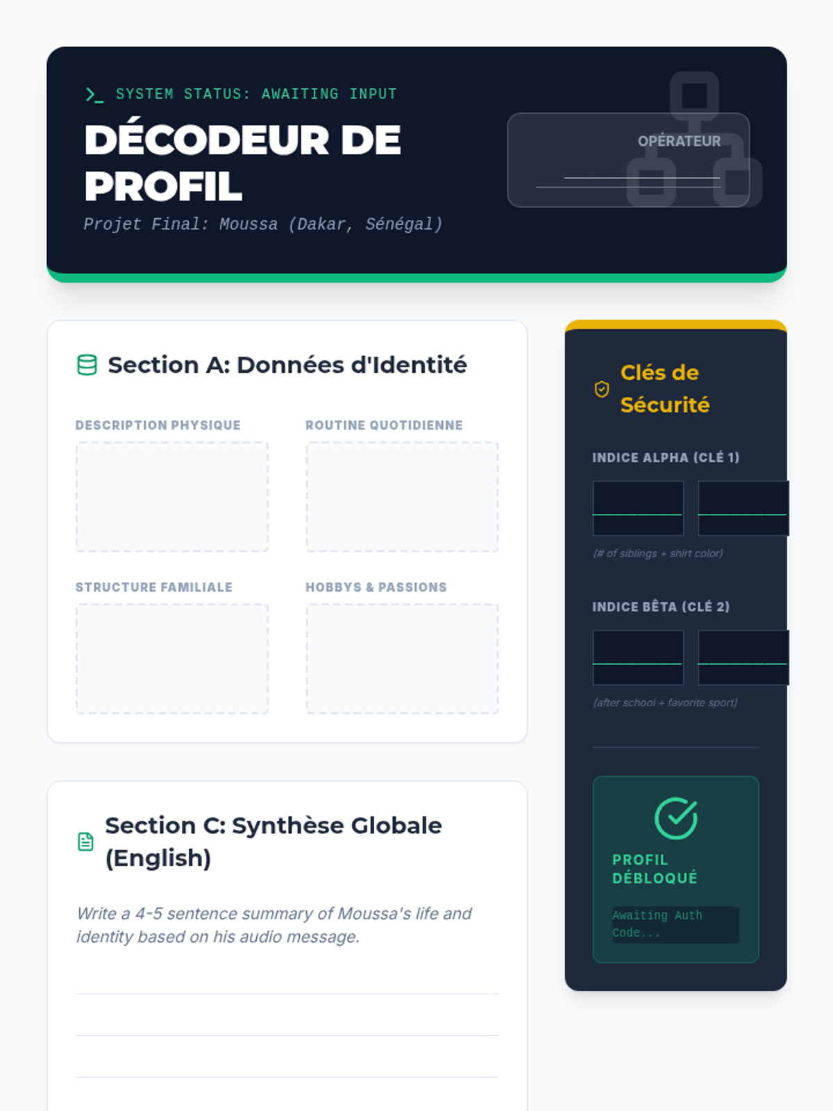 A cumulative synthesis project where students decode a comprehensive personal narrative from a Francophone pen pal.