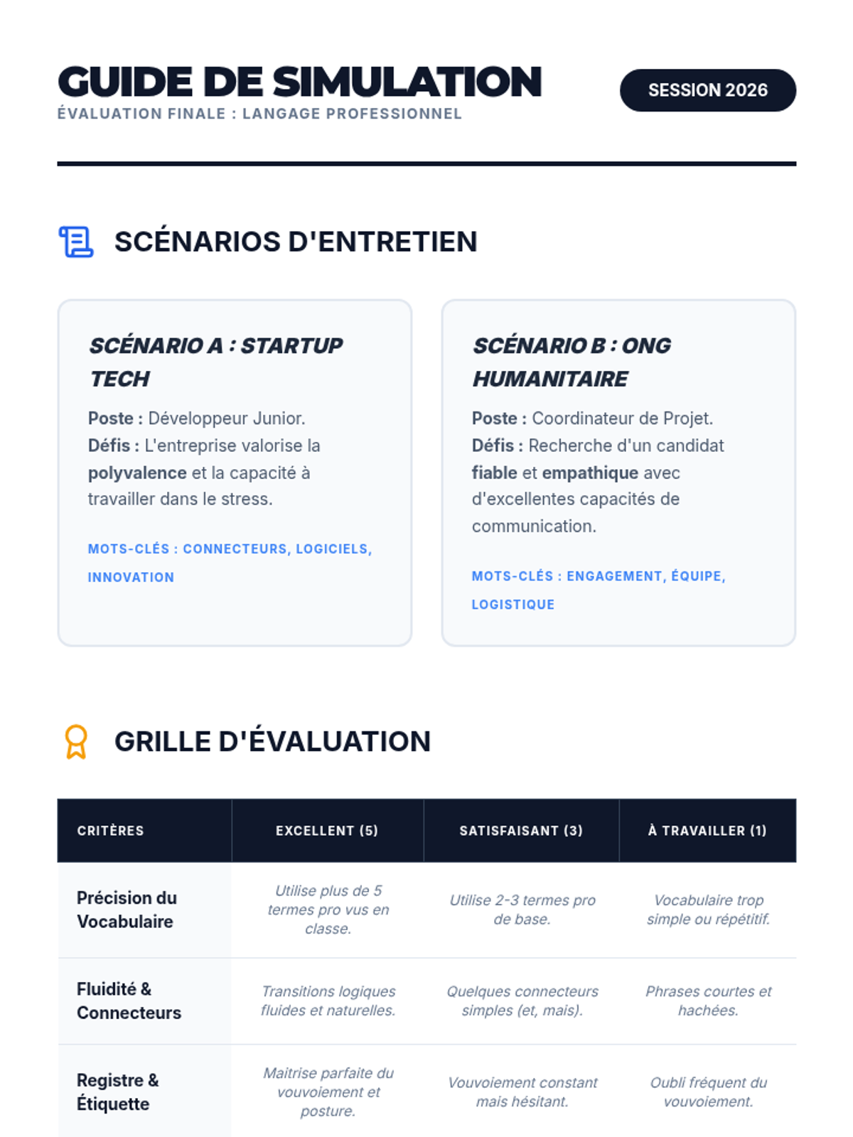 Synthesizing the unit's vocabulary, students participate in mock job interviews using the precise vocabulary, connectors, and formal register practiced.