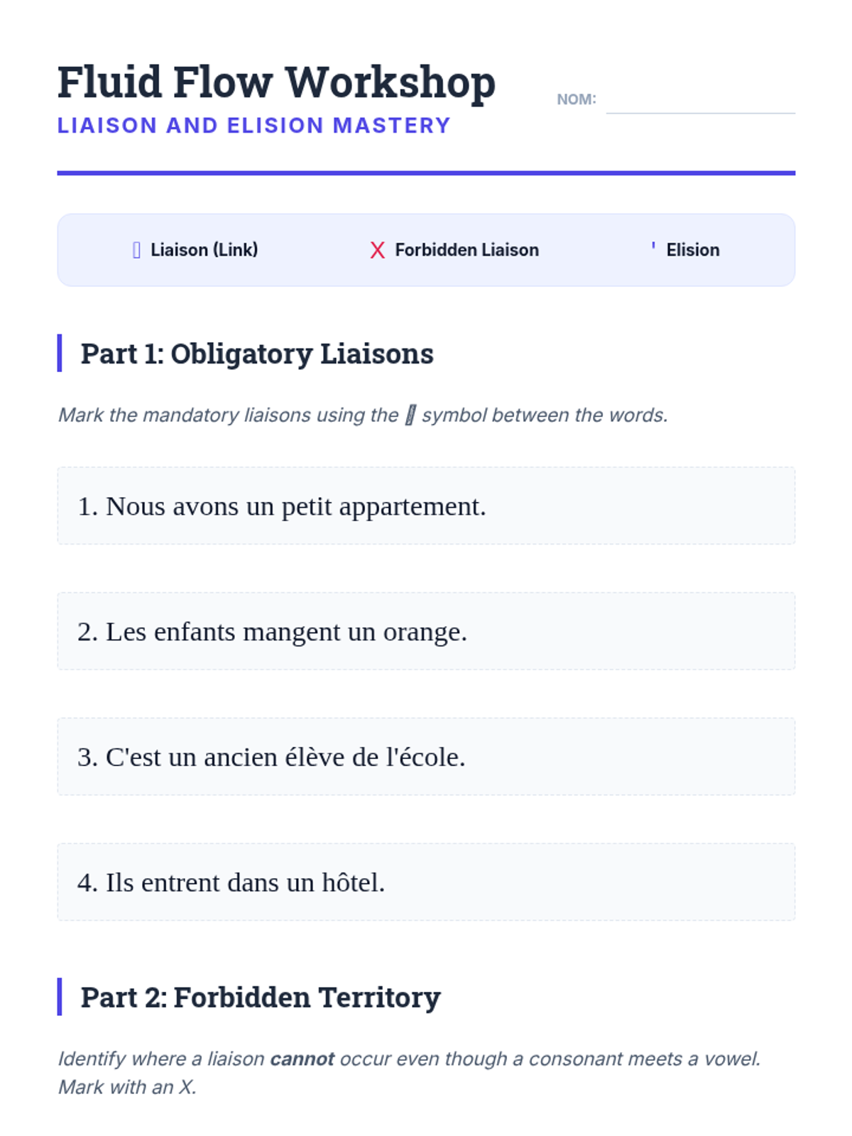 Exploration of the rules governing liaison and elision to achieve the characteristic fluid sound of French. Students practice marking and executing word connections.