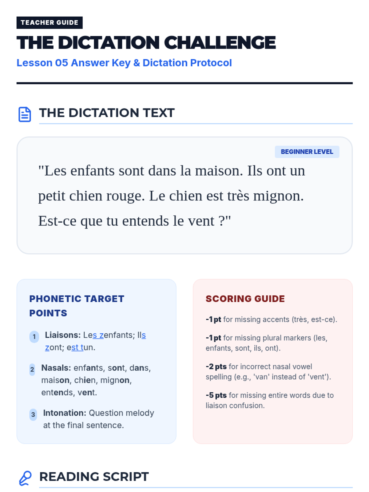 A culminating transcription practice (dictée) that synthesizes phonetic and orthographic skills.