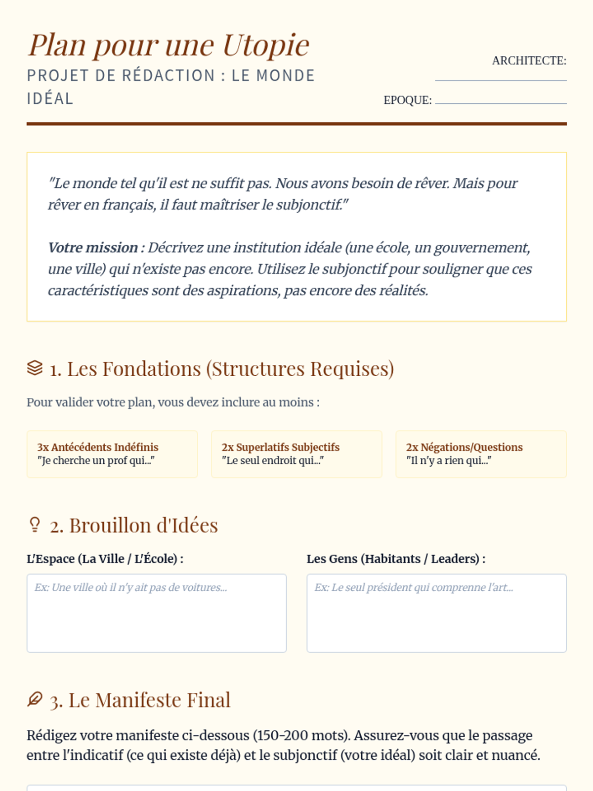 Students apply their knowledge to describe an ideal, hypothetical world, using the subjunctive to maintain the boundary between dream and reality.