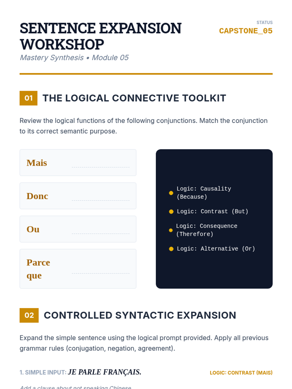 Students elevate their sentence complexity by incorporating logical connectors to transform simple sentences into cohesive, professional paragraphs.