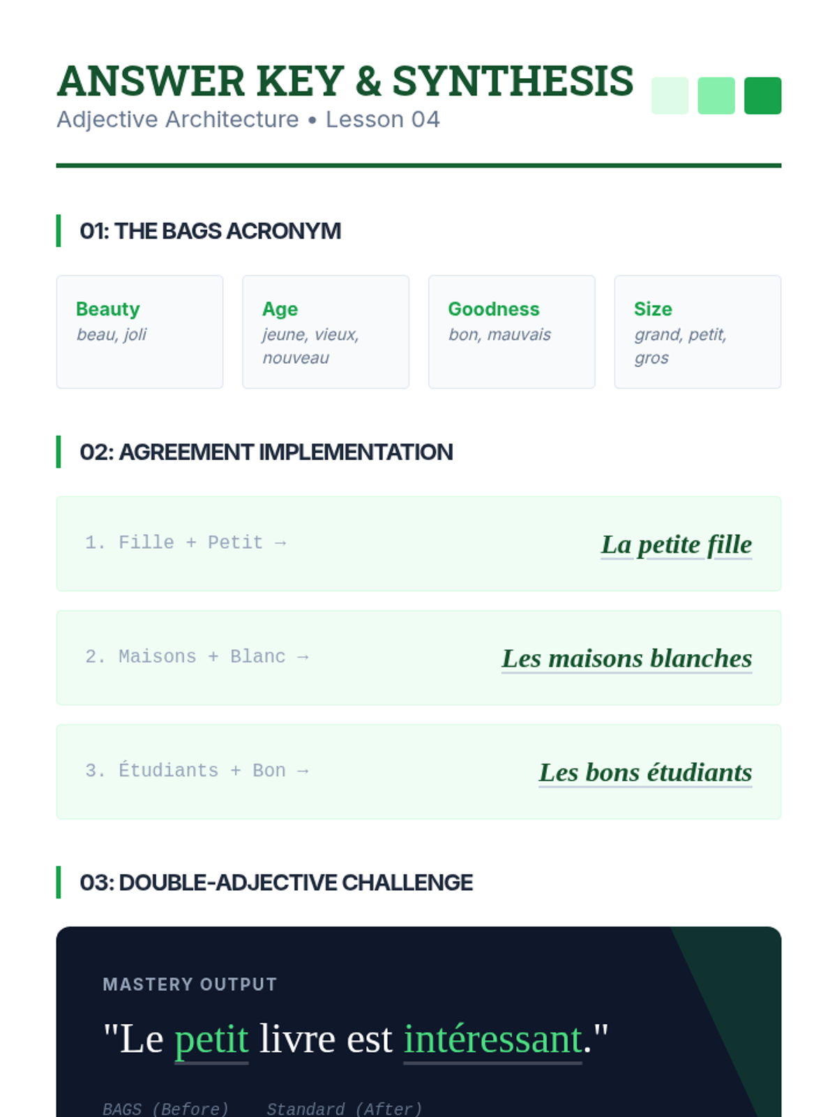Investigates the placement and agreement of adjectives, focusing on the BAGS rule and gender/number harmony.