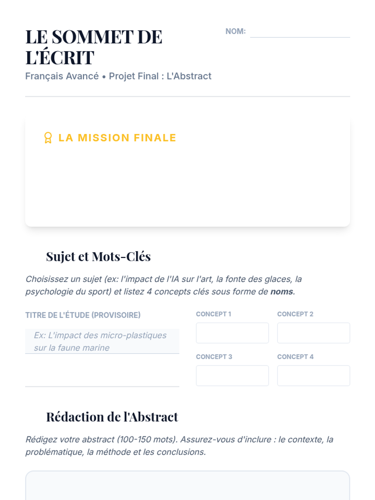 The capstone lesson where students produce a formal research abstract. They synthesize all previous skills to create a professional summary of a hypothetical academic study.