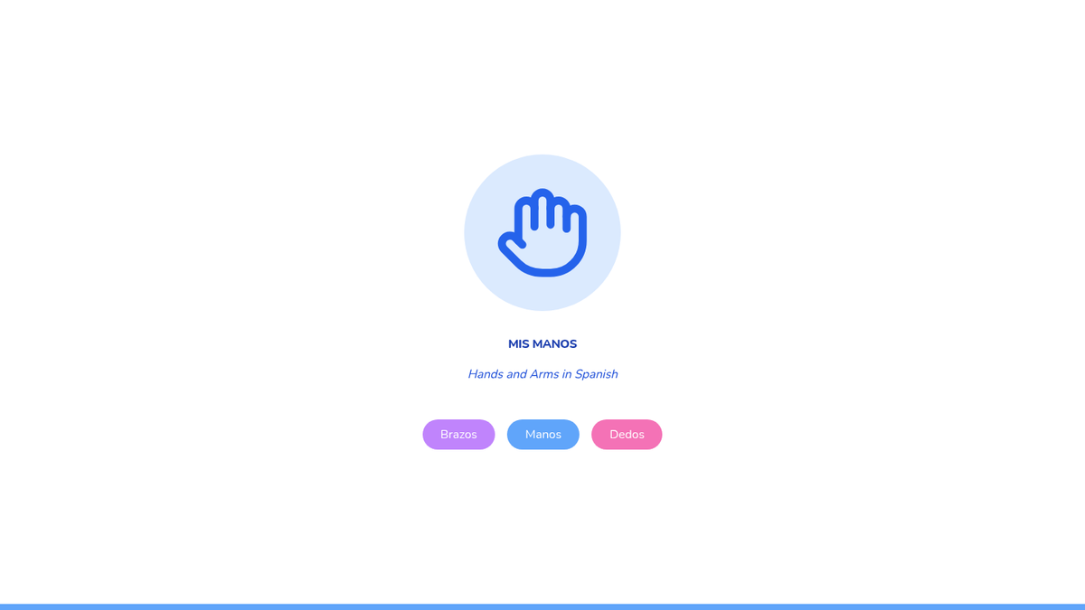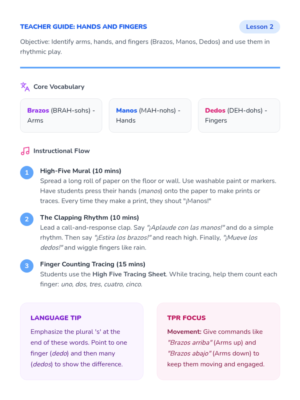 Focuses on 'brazos', 'manos', and 'dedos' using rhythmic clapping, waving, and hand-tracing art projects.