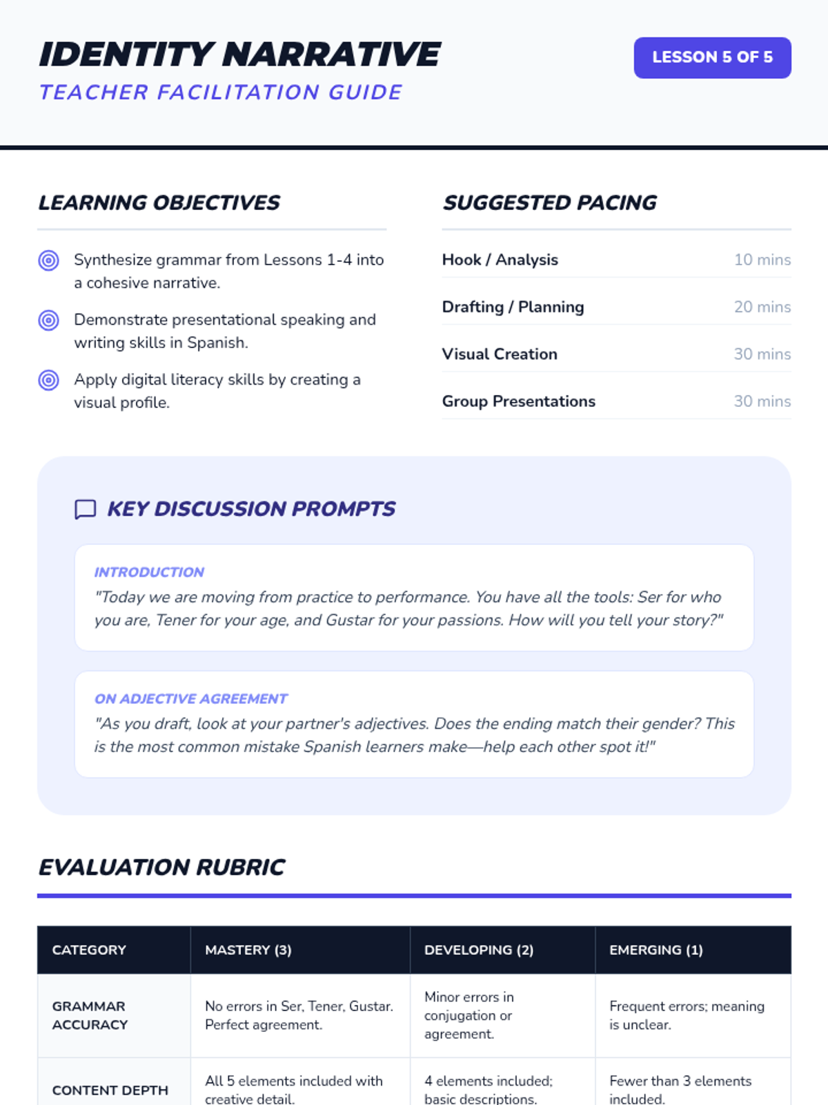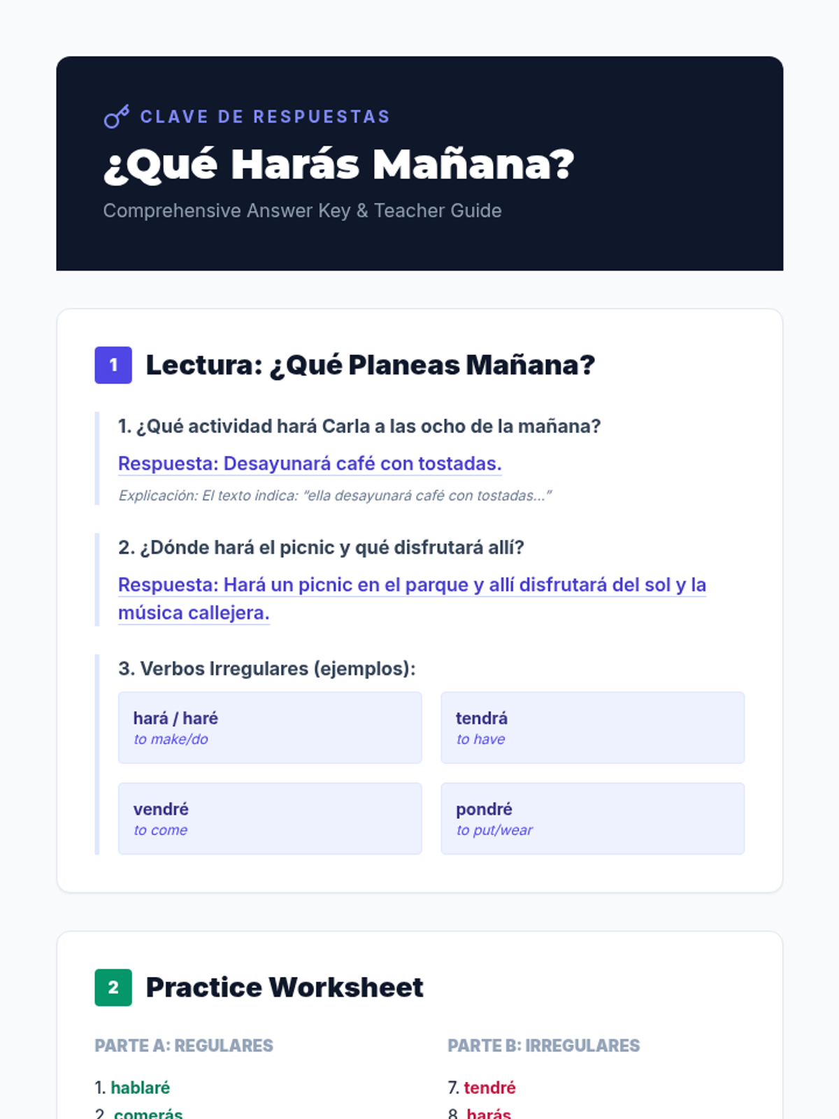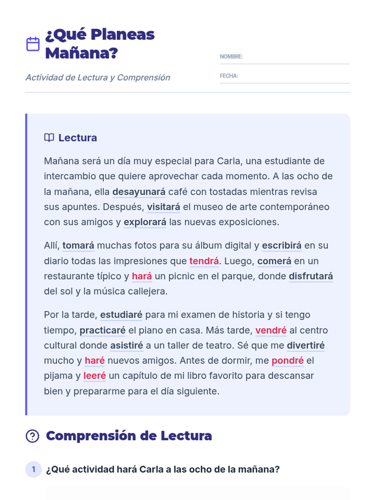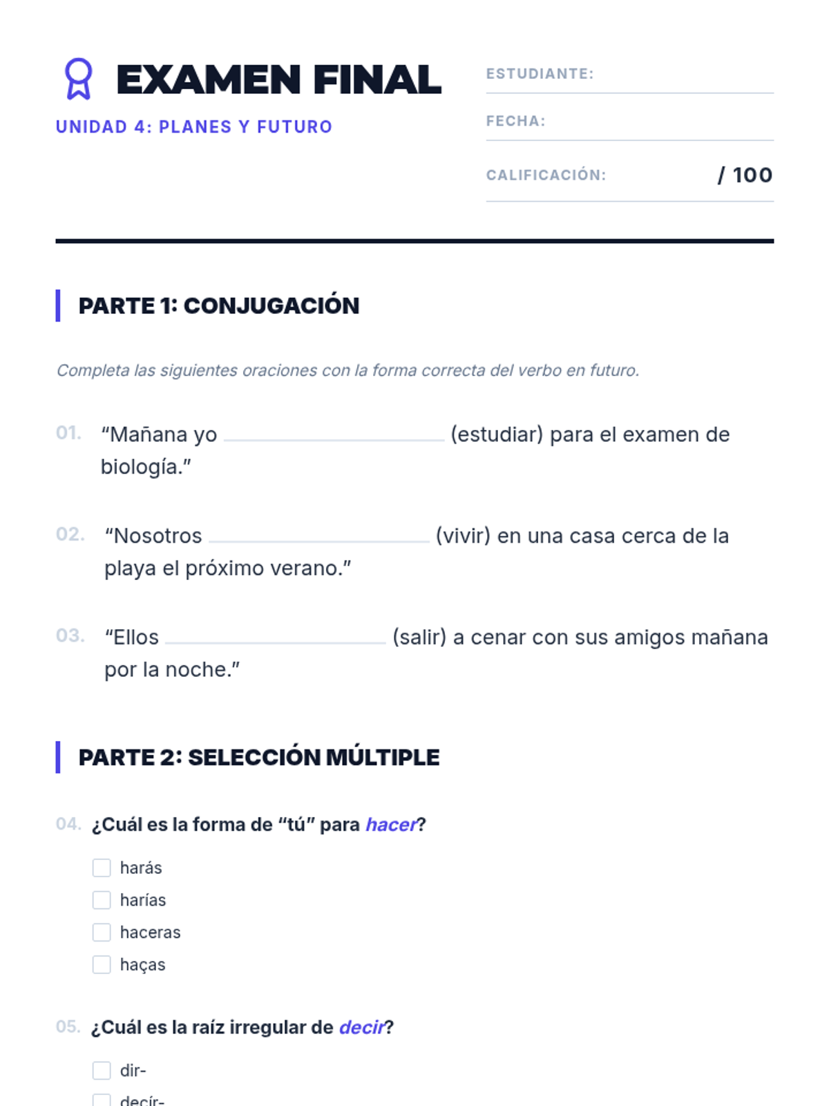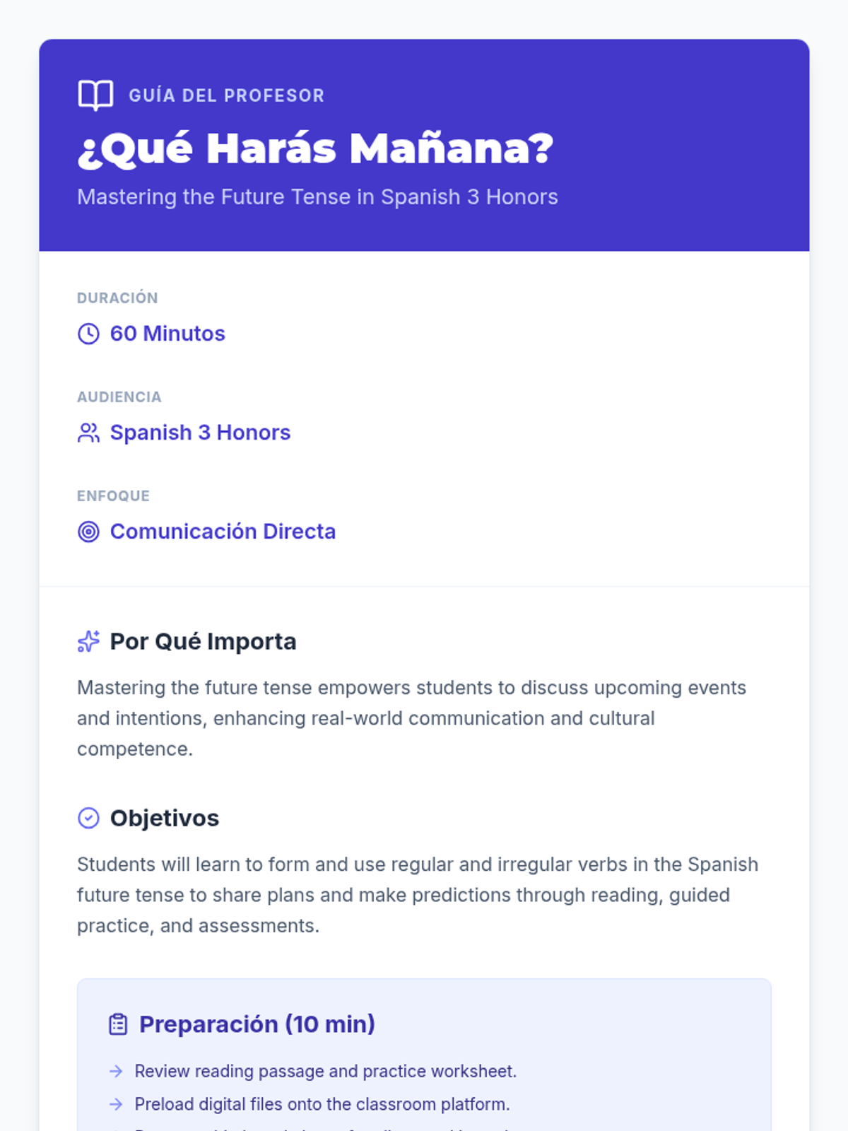 A comprehensive 60-minute Spanish 3 Honors lesson focused on mastering the future tense through reading, guided practice, and assessments. Students will learn to conjugate regular and irregular verbs to discuss future plans and predictions.