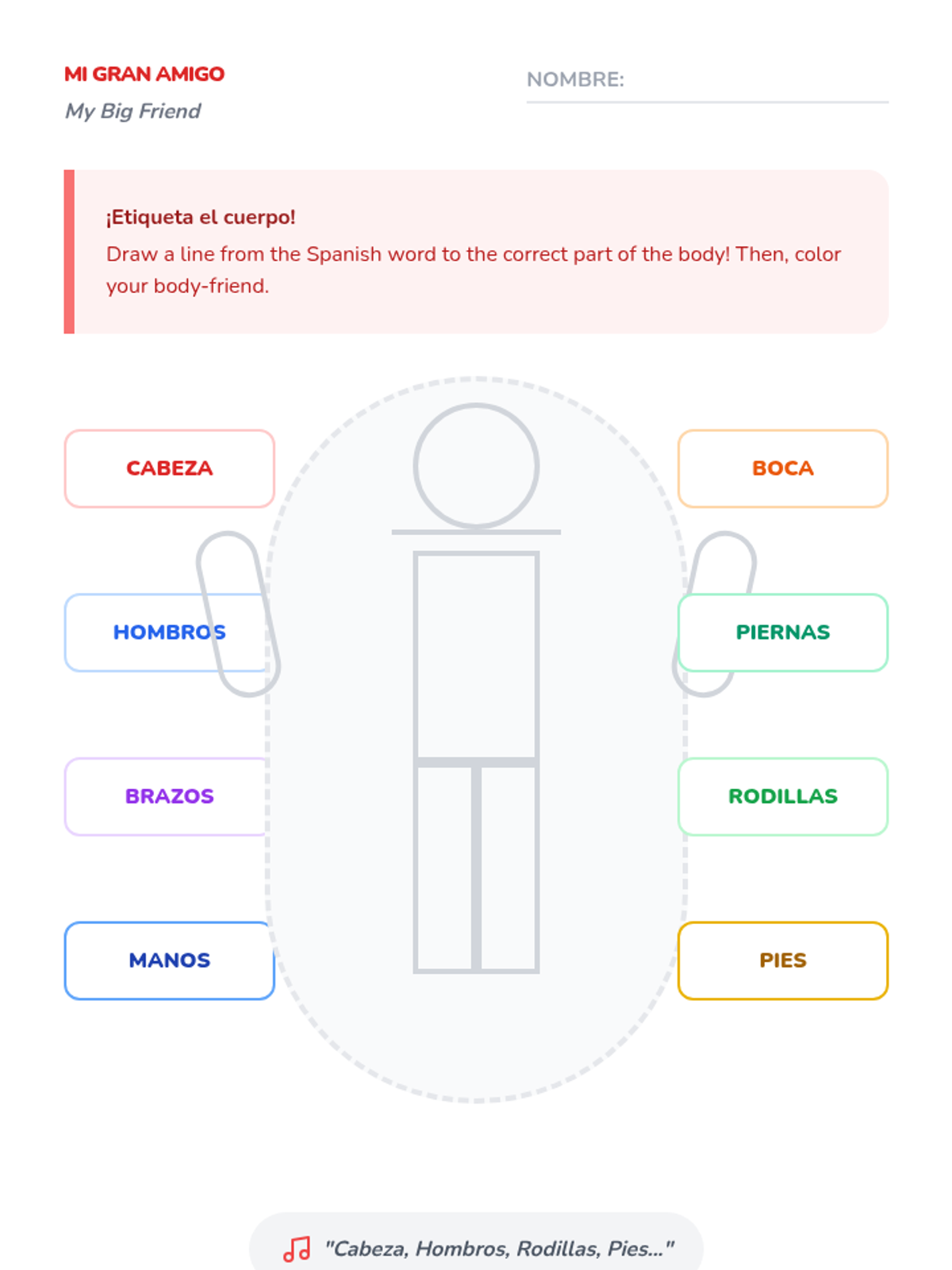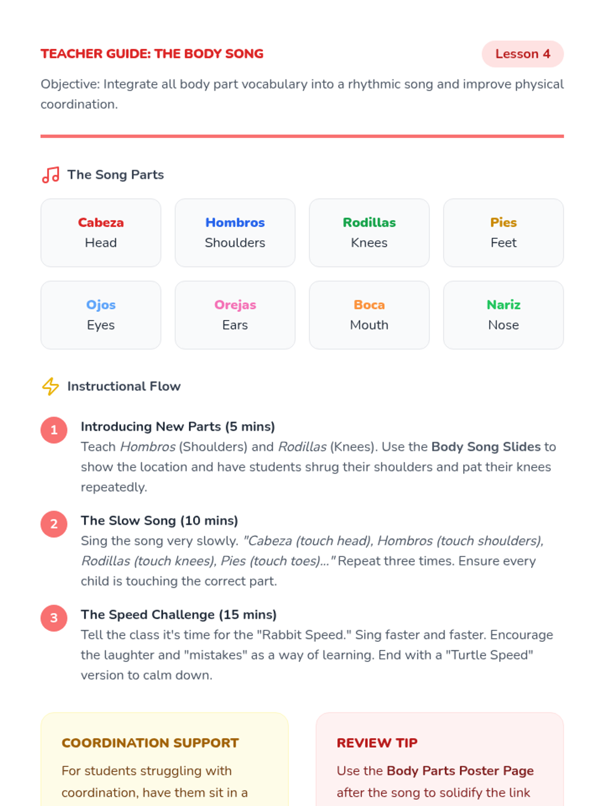 Integrates all vocabulary into the 'Cabeza, Hombros, Rodillas, Pies' song, focusing on coordination and speed.
