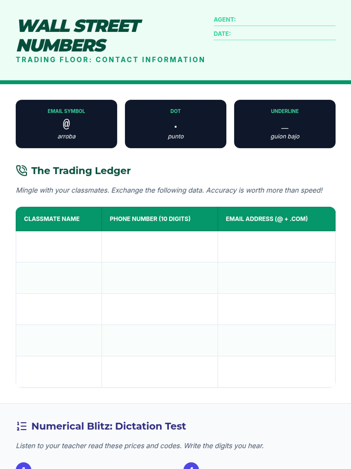 A high-energy focus on numbers 0-100 and the mechanics of exchanging digital identities (phone numbers, social handles, and emails). Students practice auditory processing through fast-paced simulations.