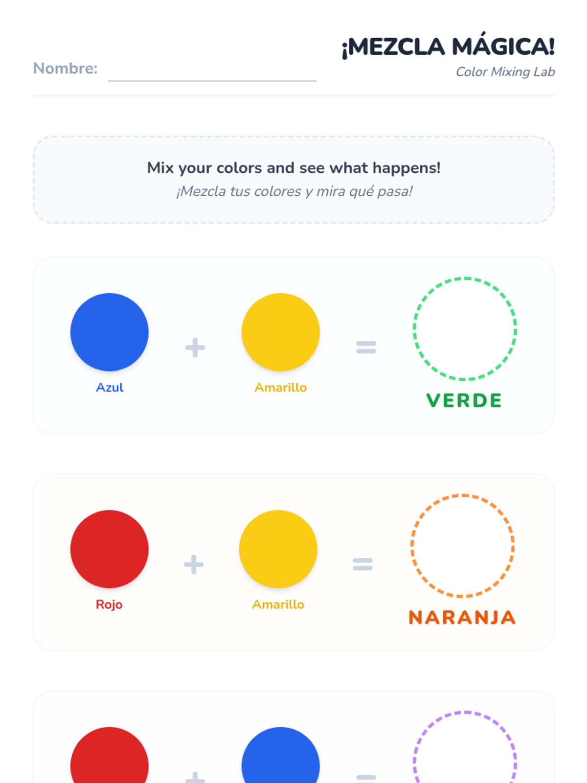The class expands to 'verde', 'naranja', and 'morado' by mixing playdough or paints. Students label items in the classroom that match these new colors.