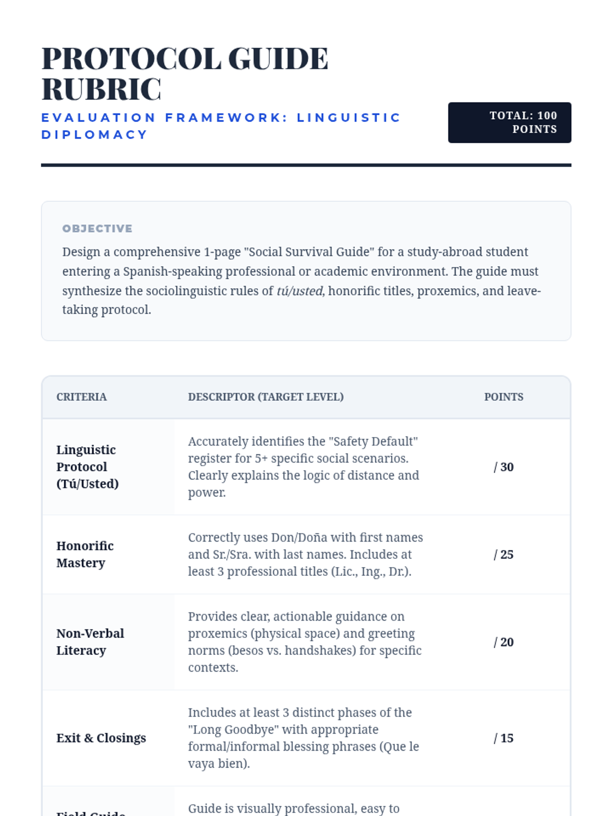 Students apply their knowledge to analyze recorded interactions and create a 'Protocol Guide' to navigate social hierarchy in Spanish-speaking environments.