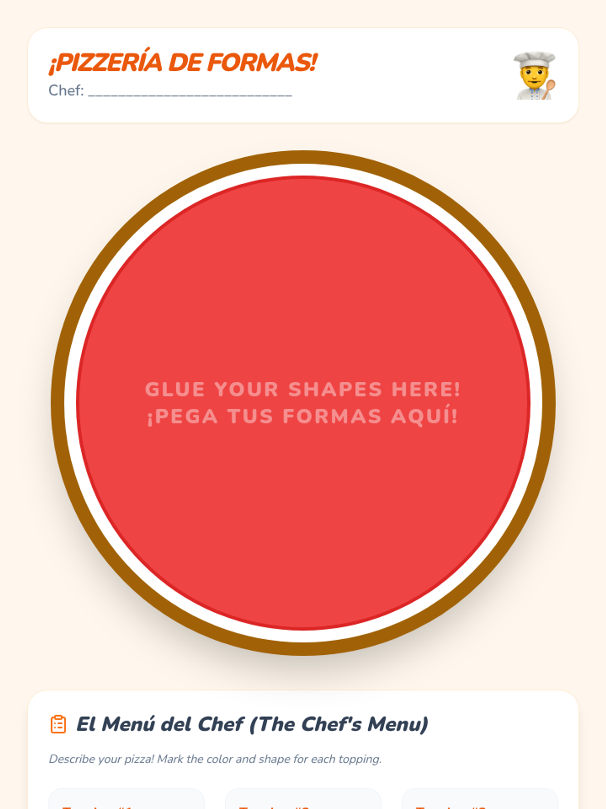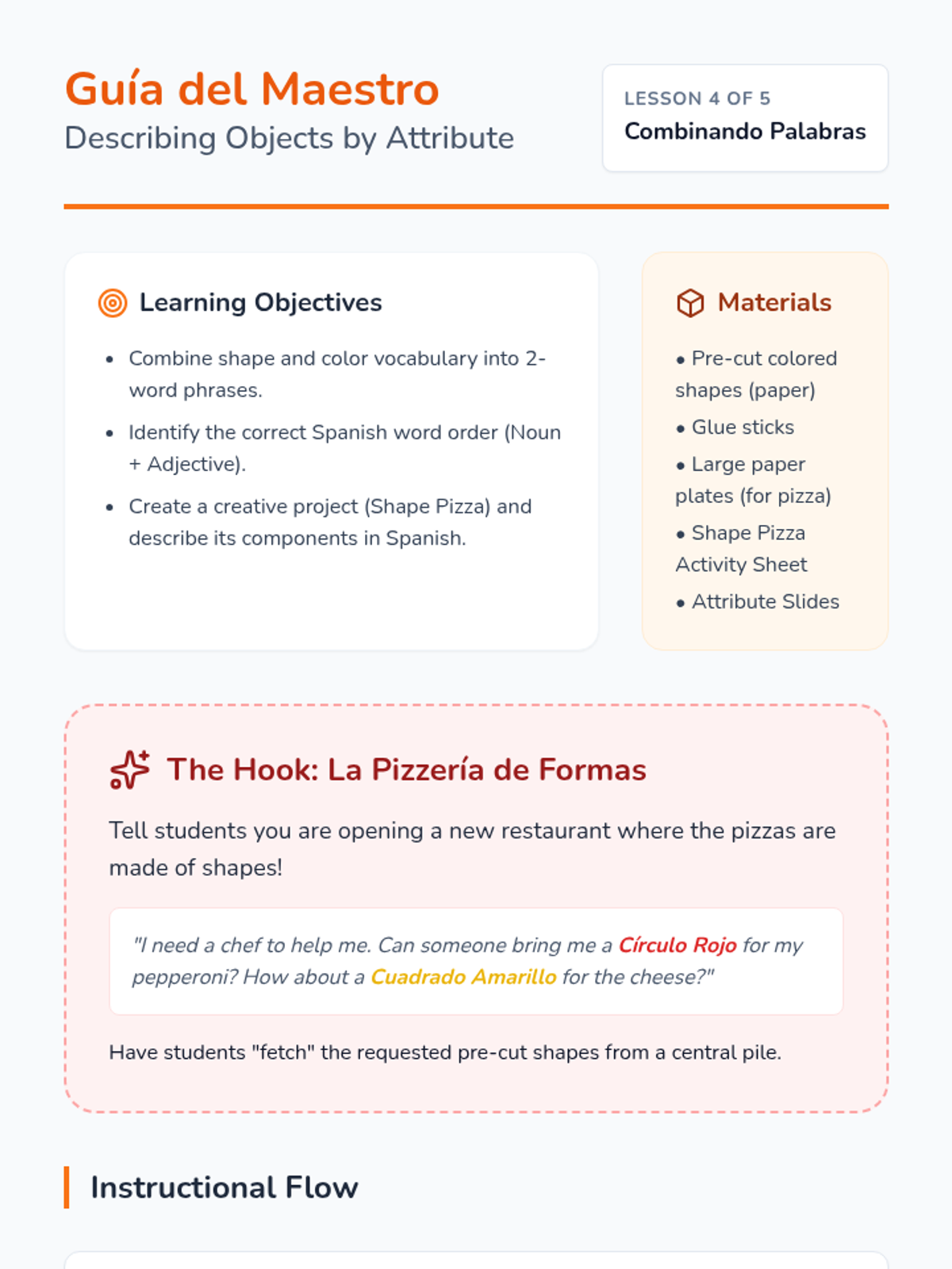 Students combine color and shape vocabulary to describe items (e.g., 'círculo rojo'). They create a collage using pre-cut colored shapes and describe their artwork.