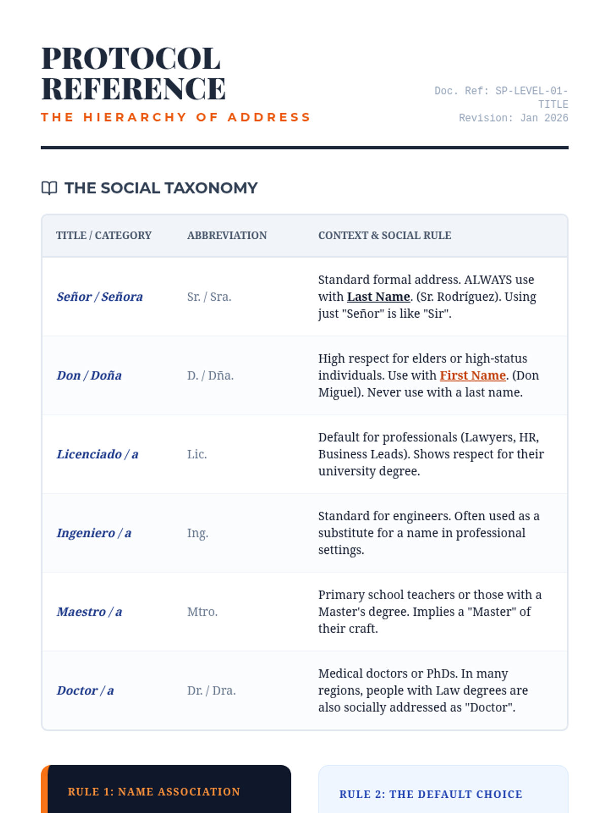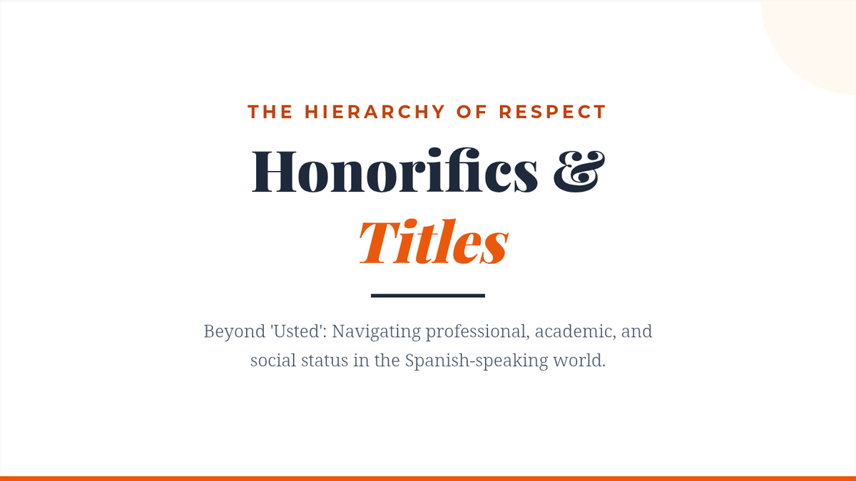 Students learn professional and social titles such as Don/Doña and Señor/Señora, emphasizing their use in academic and business settings to demonstrate respect.