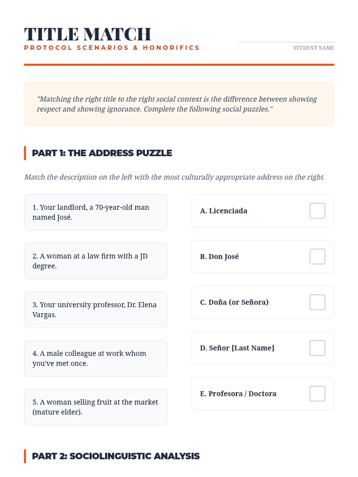 Students investigate the nuances of 'tú' vs 'usted' and formal etiquette in diverse social hierarchies. They practice code-switching based on audience and context.