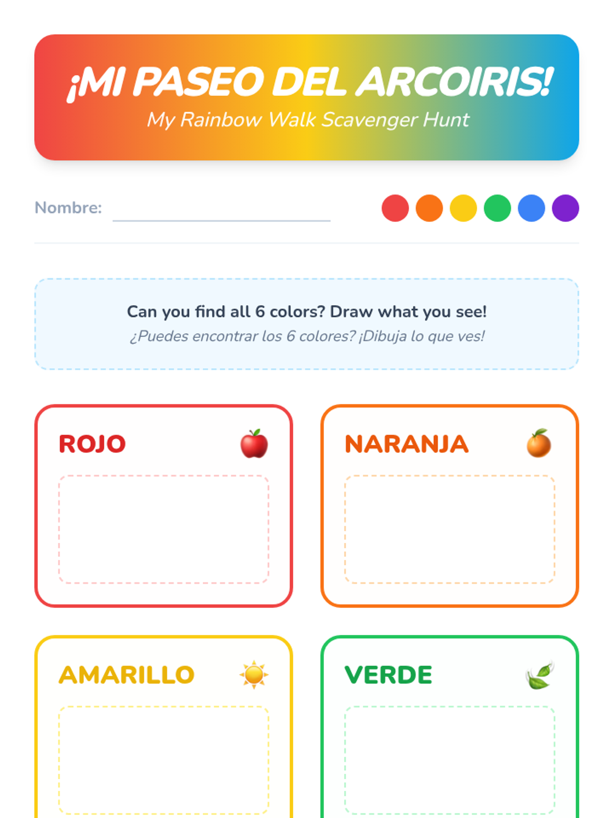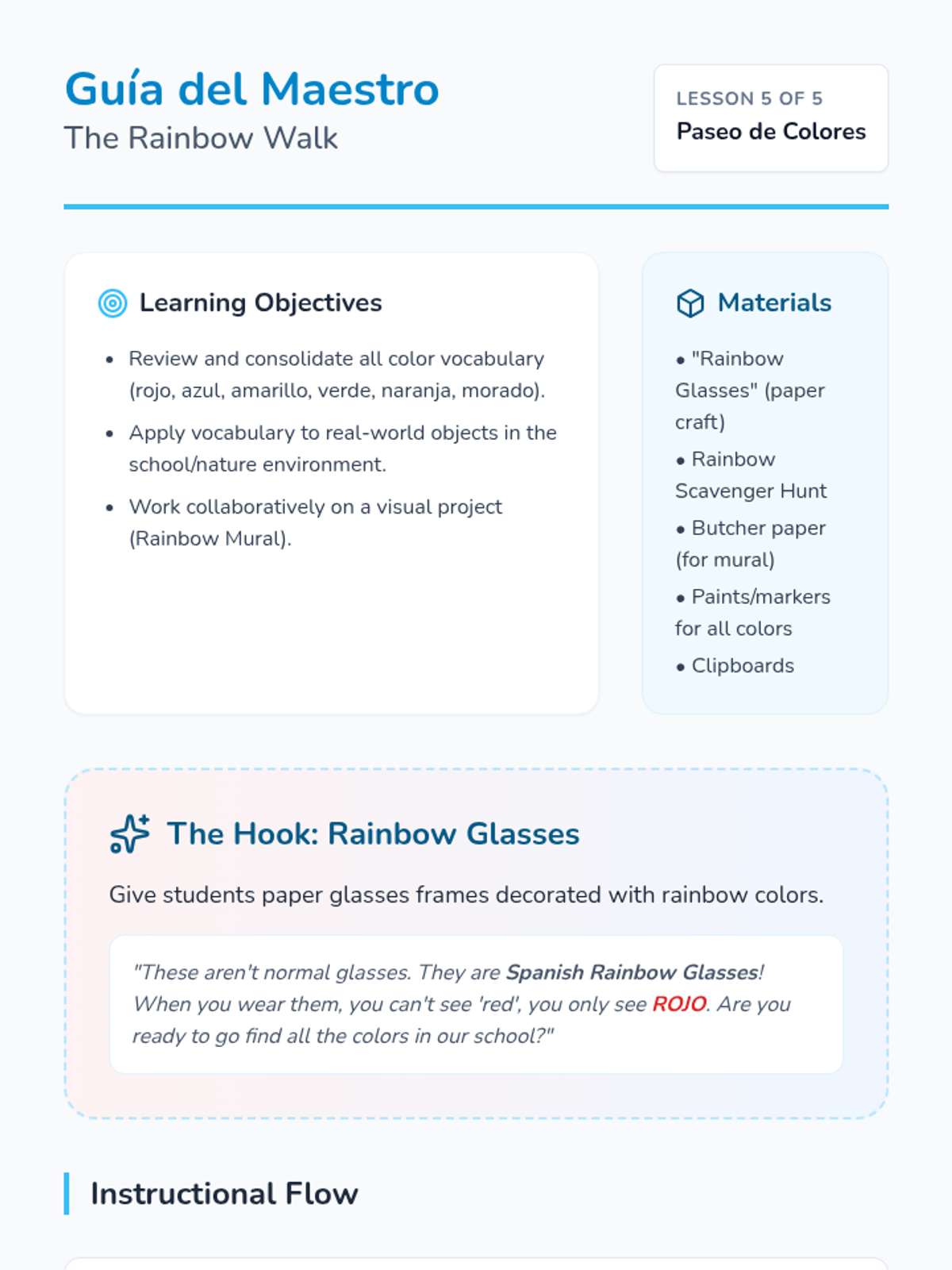 A culminating nature walk (or school walk) where students point out things they see using their color vocabulary. They create a collaborative rainbow mural reviewing all learned colors.