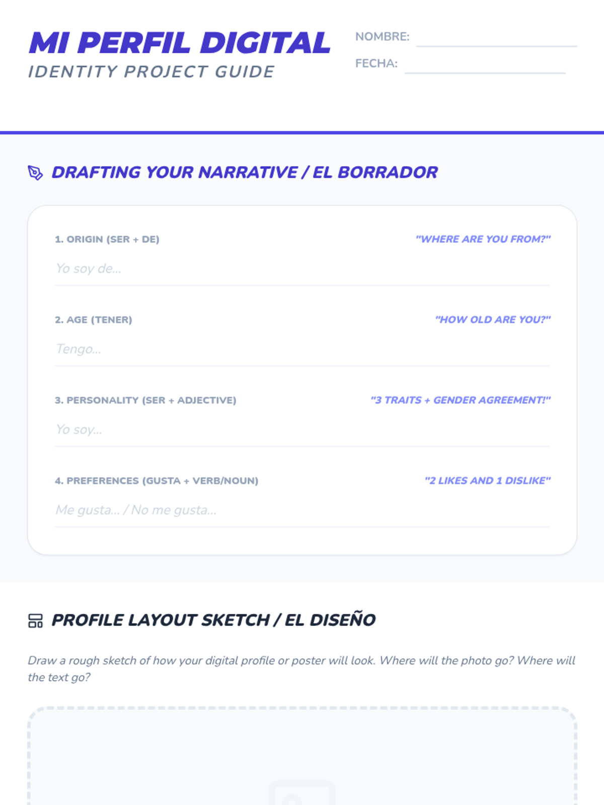 Students expand their use of 'ser' by adding high-frequency adjectives. They learn the rules of gender and number agreement while describing themselves and classmates.