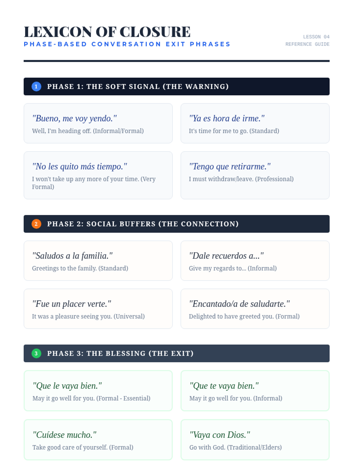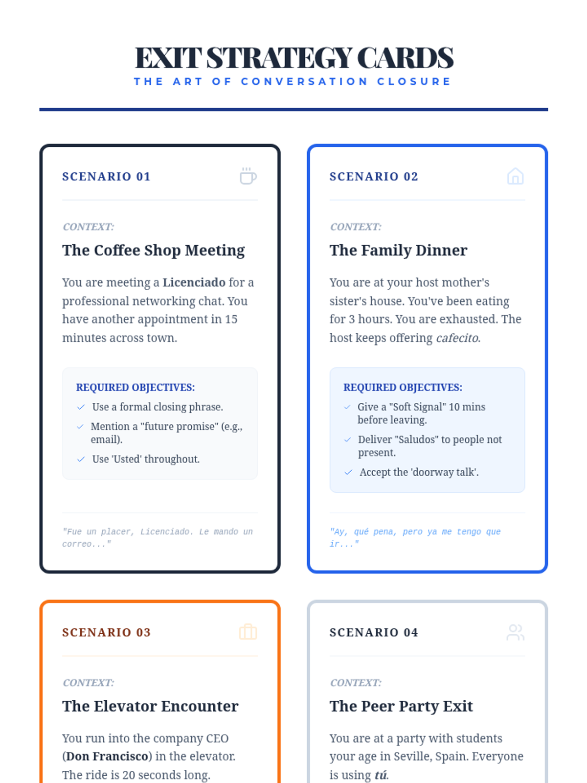 Students practice the 'long goodbye' and learn specific phrases for polite conversation closure in Hispanic contexts, contrasting them with more abrupt cultural norms.