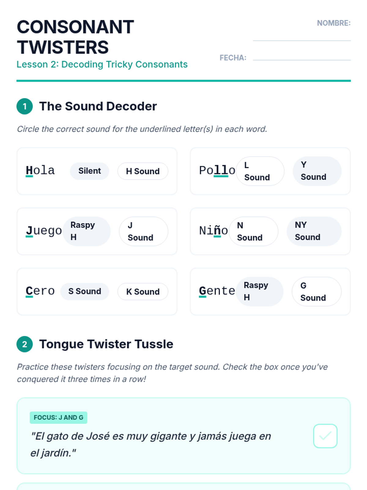 This lesson introduces consonants that function differently in Spanish, such as h (silent), j (aspirated), ll, ñ, and z/c. Students practice tongue placement and air flow to produce these sounds accurately through tongue twister challenges.