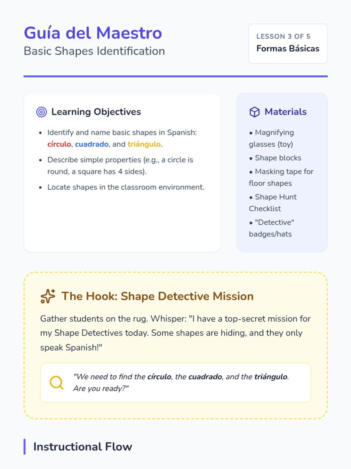 Learners identify 'círculo', 'cuadrado', and 'triángulo' using shape blocks and floor mats. They trace shapes in the air and find matching shapes in the room.