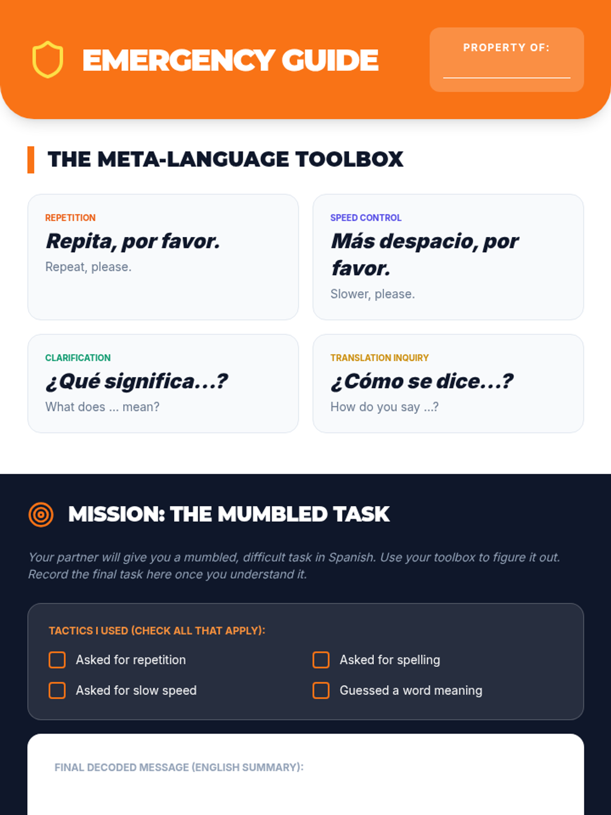 Students master the 'meta-language' of the classroom and social interaction, learning how to ask for repetition, clarification, and translations to keep conversations flowing.