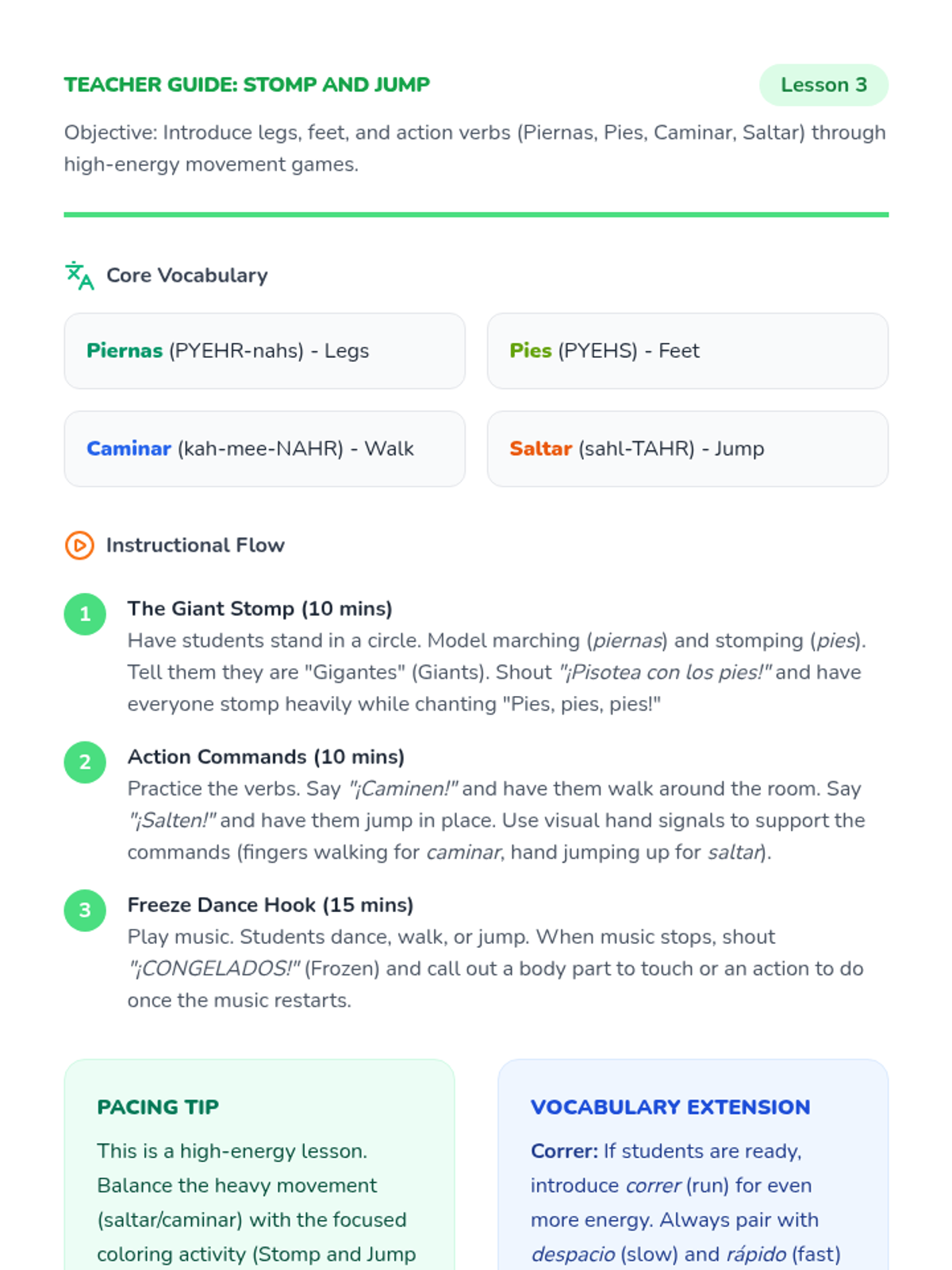 Introduces 'piernas', 'pies', 'caminar', and 'saltar' through stomping games and a high-energy 'Freeze Dance'.