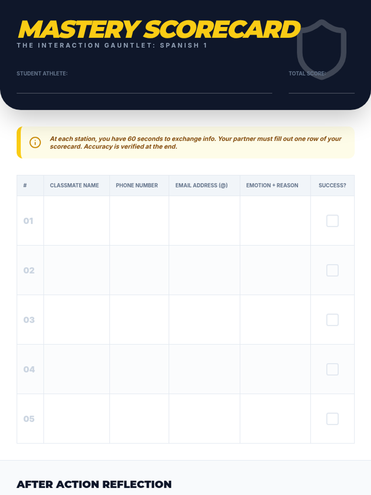 A high-energy speed-friending event where students rotate through timed conversations to build social stamina and demonstrate fluency.