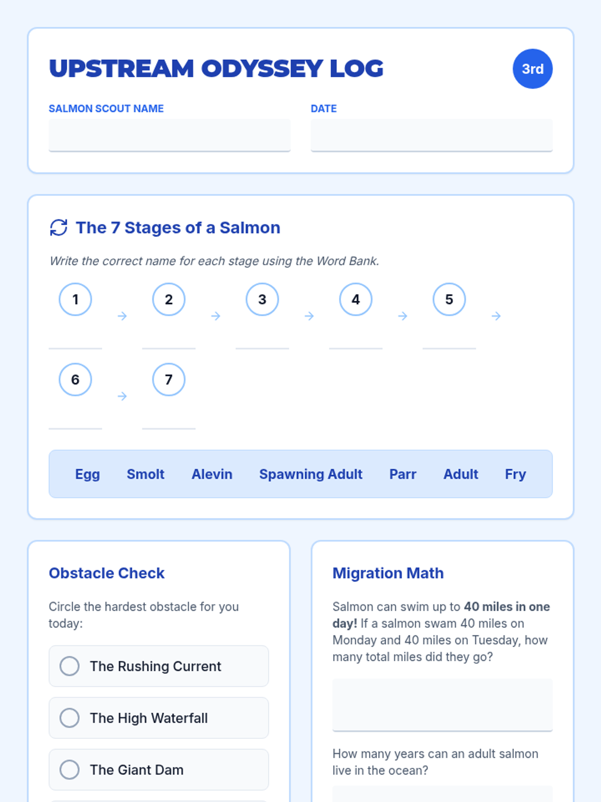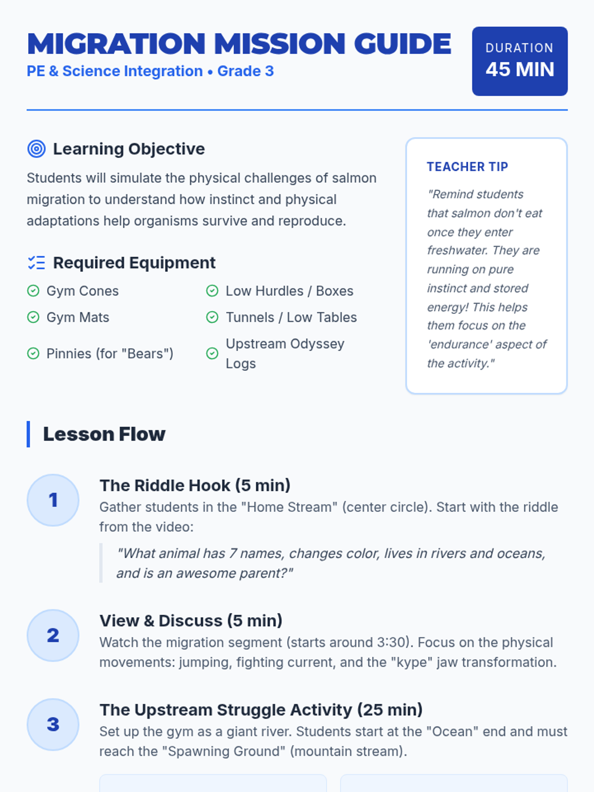 A 3rd-grade PE and Science integration lesson where students simulate the treacherous upstream journey of salmon through an obstacle course while learning about life cycles, adaptations, and instinct.